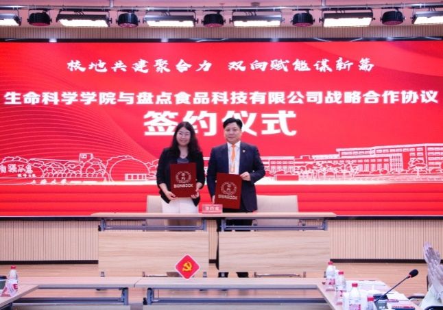 会上,宝山区罗泾镇党委书记张建平、上海大学生命科学学院党委书记陈付学为“上海大学生命科学学院与上海盘点食品科技有限公司食品科技人才培养实践基地”揭牌。宝山区科委副主任龙小东、上海大学生命科学学院副书记、副院长朱晓青为“上海大学生命科学学院与上海盘点食品科技有限公司食品科技产学研合作基地”揭牌。上海盘点食品科技有限公司董事长兼CEO伍俊峰与上海大学生命科学学院副院长高海燕签署战略合作协议。在双方战略合作下,生命学院与盘点美味将深入推动产学研合作,共同助力人才培养和经济发展。
