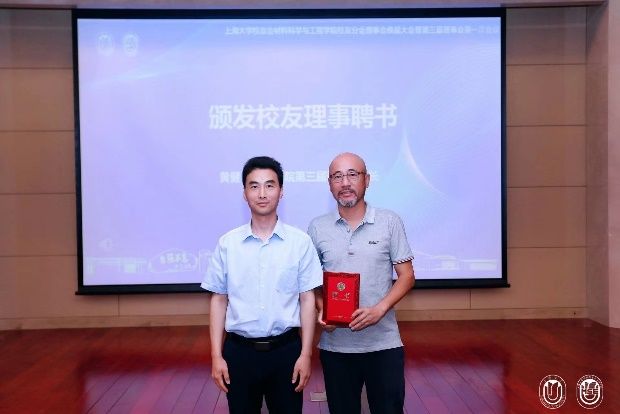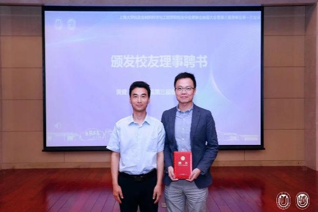 会议以无记名投票方式选举产生上海大学材料学院第三届理事会会长黄健,副会长陈晓东、黄晨、刘引烽、吕峰、王林军、谢为一、杨伟民、张东、朱明原,秘书长祁晶以及曹亚民等152位理事,材料学院第三届理事会会长黄健上台为新任理事一一颁发聘书。