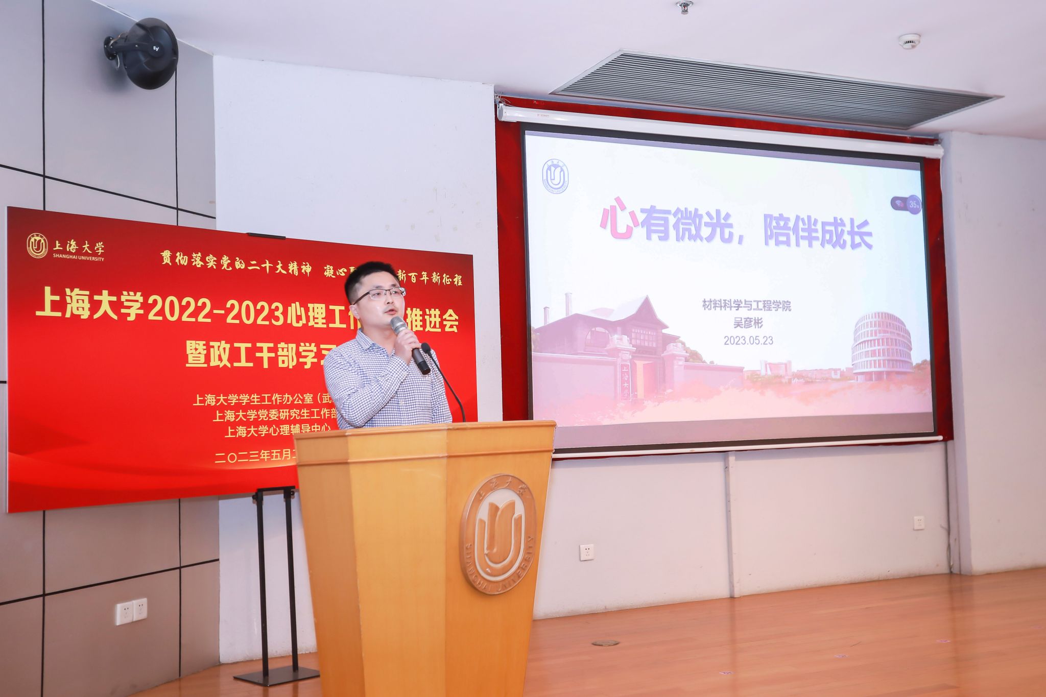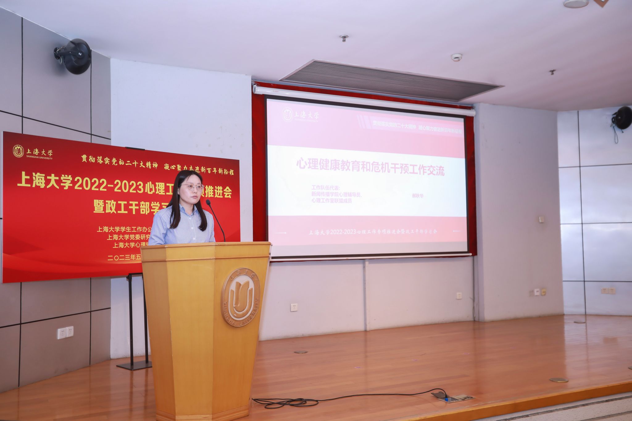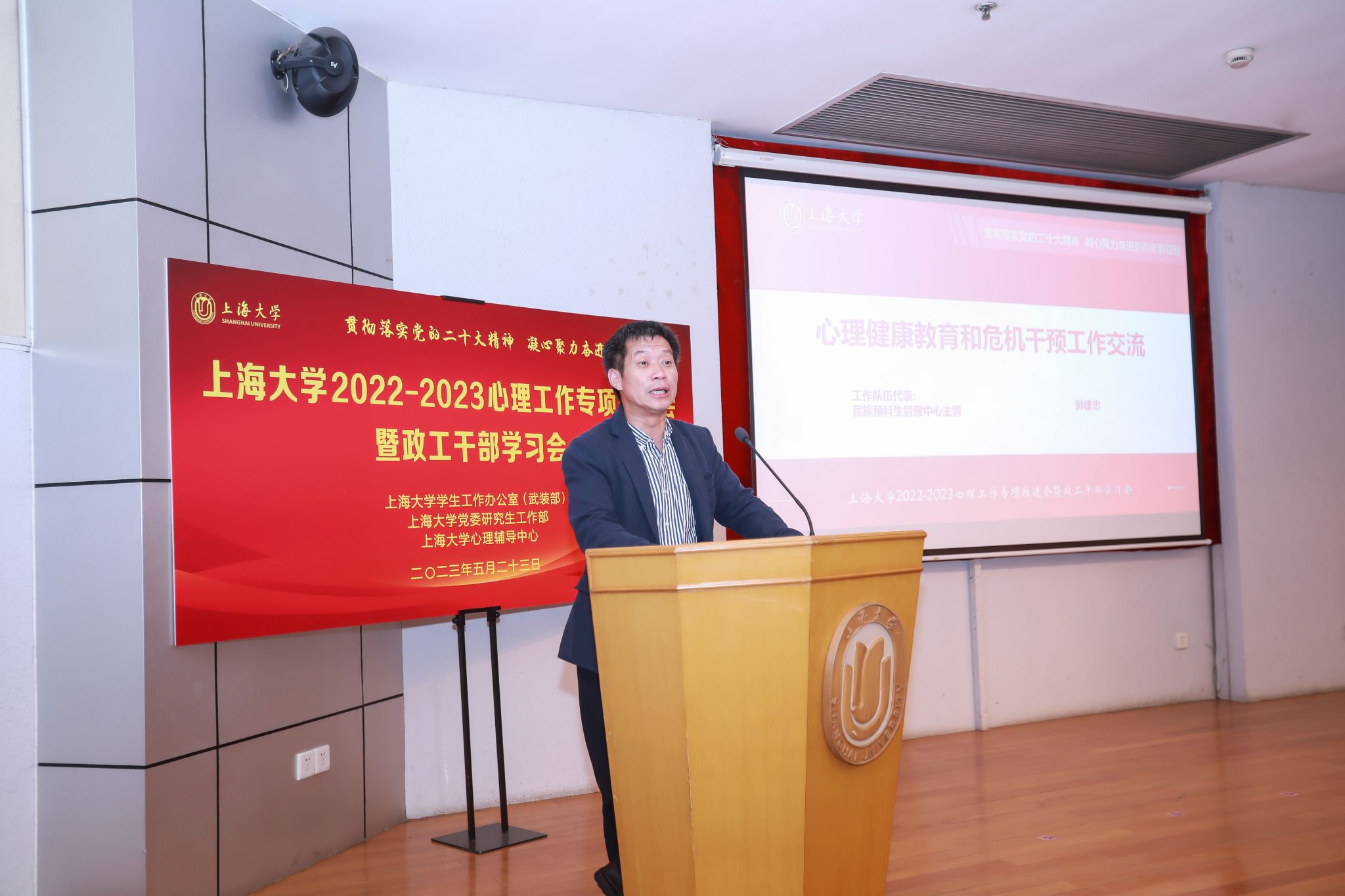 为贯彻落实党的二十大精神,进一步推进我校学生心理健康工作,5月23日下午,上海大学2022-2023年心理工作专项推进会暨政工干部学习会在行政楼报告厅举行。校党委常委、副校长聂清,学生工作办公室主任、武装部部长、本科生书院管理中心主任孟祥栋,体育学院党委副书记、院长刘兵,保卫处处长沈龙骥,校医院办公室主任周宏峰,心理辅导中心主任许静,各学院分管学生工作的党委副书记、副院长、全体本科生和研究生辅导员参加了本次会议。本次会议由党委研究生工作部部长魏宏主持。
