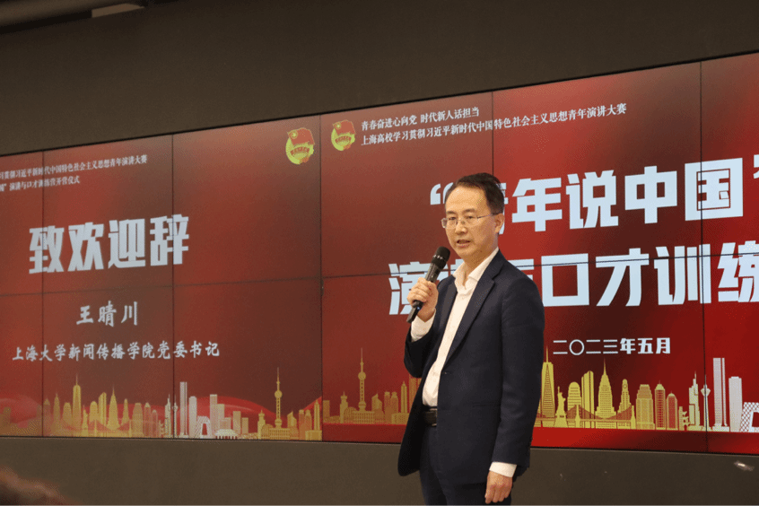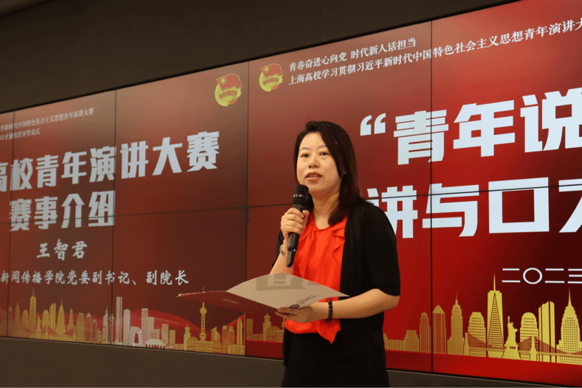 上海大学新闻传播学院党委副书记、副院长王智君介绍了上海高校青年演讲大赛的举办背景和意义,并对本次赛事安排做了详细说明。