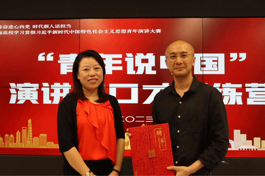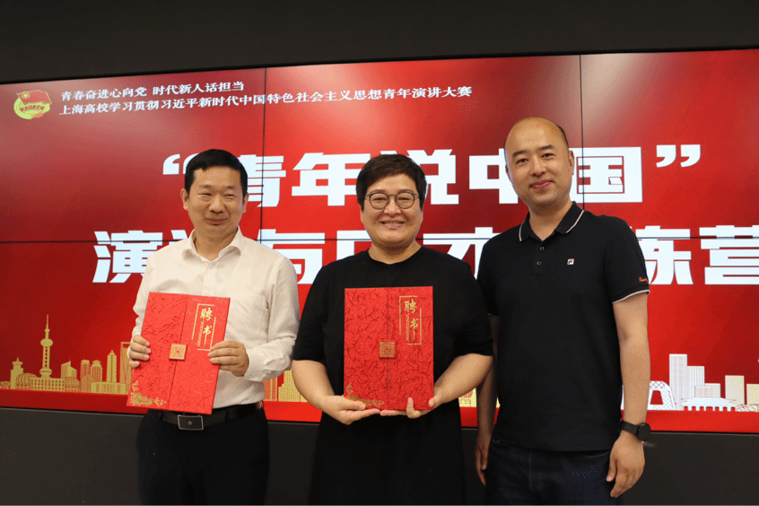 上海大学闳约书院执行院长,上海美术学院党委副书记、副院长曹俊,新闻传播学院党委副书记、副院长王智君为李宽、白瑞、林毅三位主讲老师颁发训练营指导教师聘书。