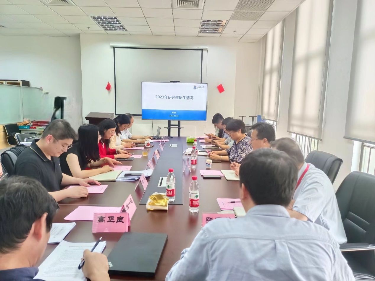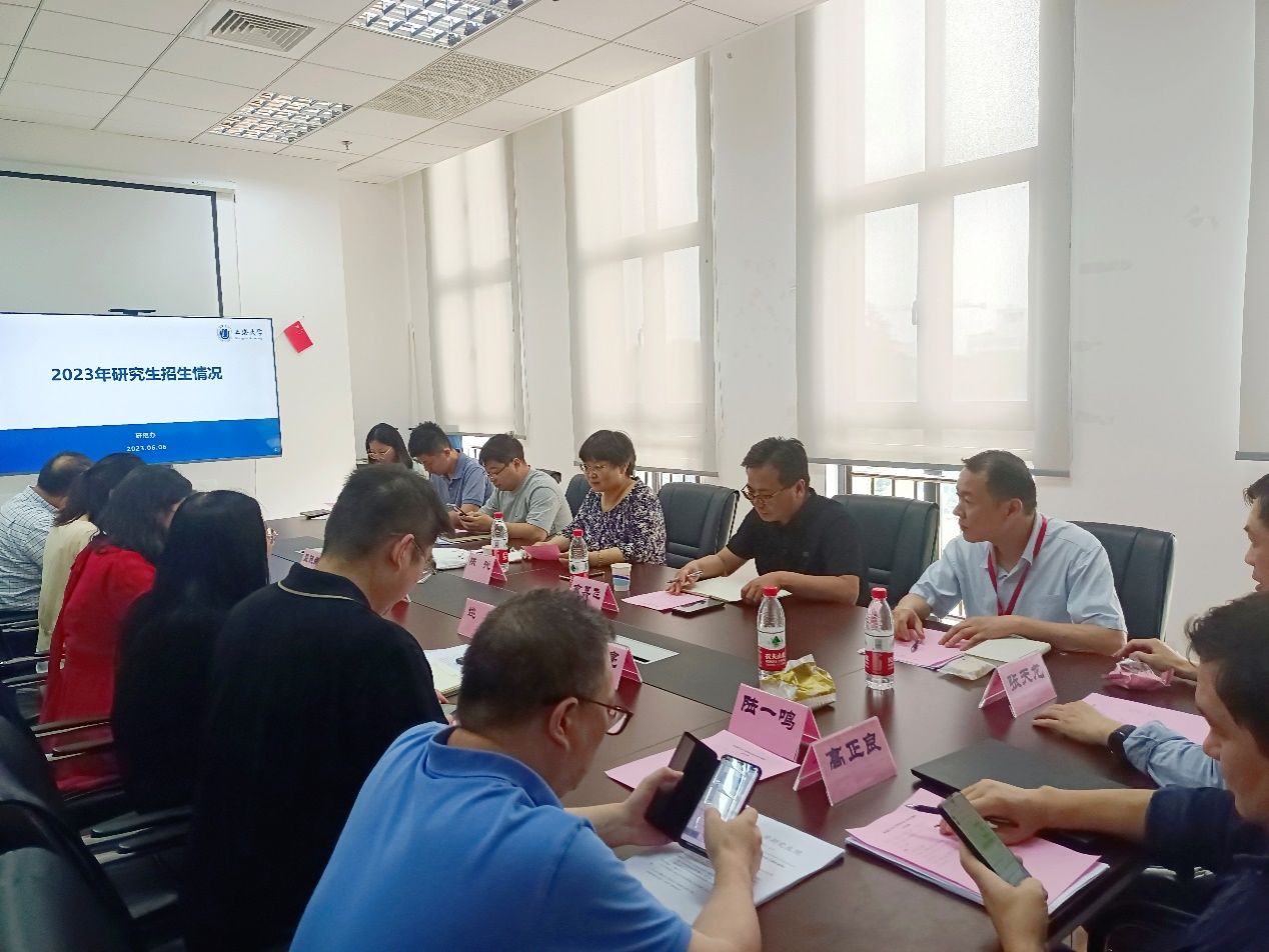 为做好医学院2024年研究生招生宣传工作,提高生源质量,推进学院研究生教育迈上新台阶,6月6日下午,医学院召开研究生招生宣传专题研讨会。此次专题会特邀研究生院招生办主任陈沁教授和招生办主管玄其飞老师参加并作生源质量分析和相关政策解读。会议由医学院副院长姚萱主持,医学院党委书记李娟、学院领导班子成员、学科点负责人及学院部分硕、博导师和教学管理人员参加会议。