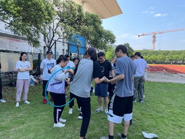 第二个项目是穿越呼啦圈,这是一个十分考验同学们身体协调性和默契度的项目,同学们灵活地在呼啦圈中穿梭,在短短的十几秒内就让呼啦圈穿过了整个队伍。经过激烈的角逐后,由我们的第一组同学获得了这一轮比赛的胜利。