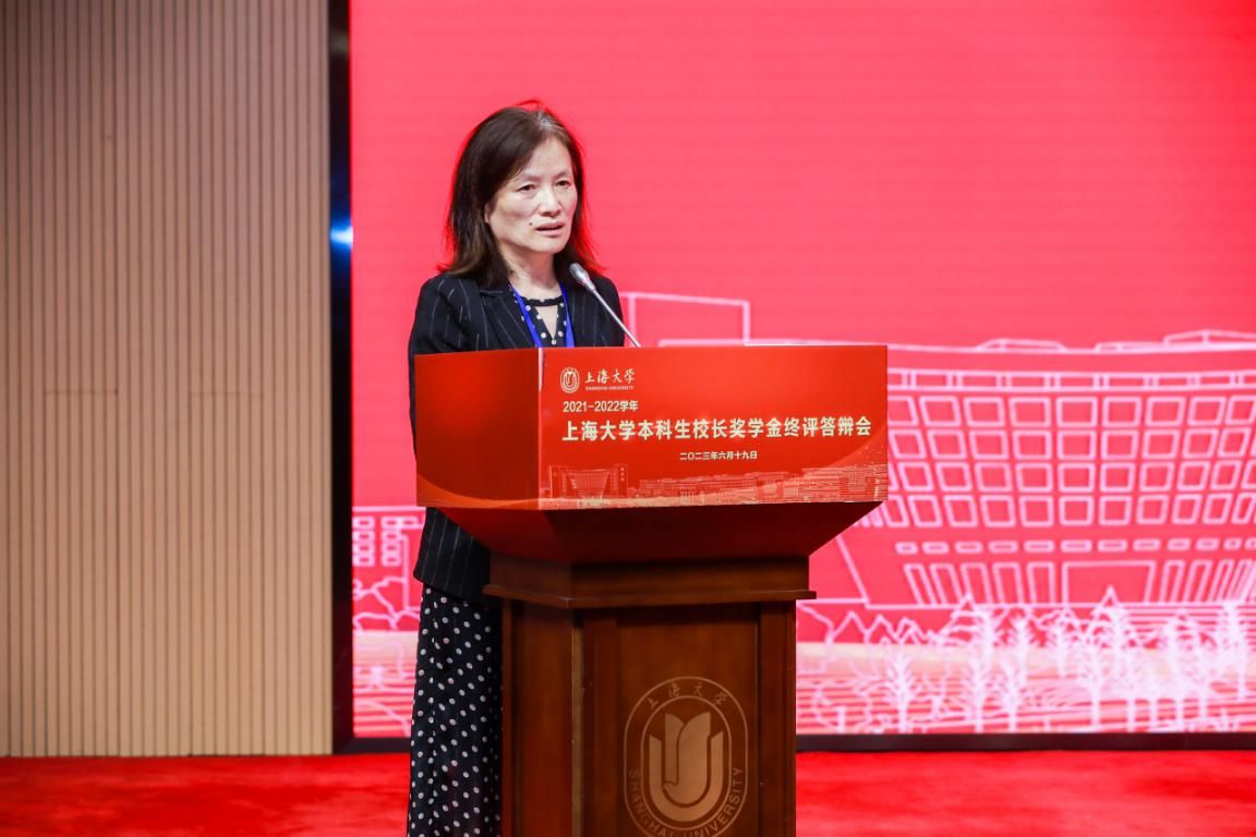 2023年6月19日下午,我校2021-2022学年本科生校长奖学金终评答辩在宝山校区图报厅如期举行,并由上大学工官方视频号同步线上直播,近2.5万名师生和校友观众共同见证新一届校长奖学金获奖人的诞生。校党委常委、副校长聂清、市学生德育发展中心副主任杨智勇,同济大学、华东理工大学和上海师范大学等兄弟高校、第一届校长奖学金获得者代表以及学校教务部、团委等部处领导,共同出席了本次活动。