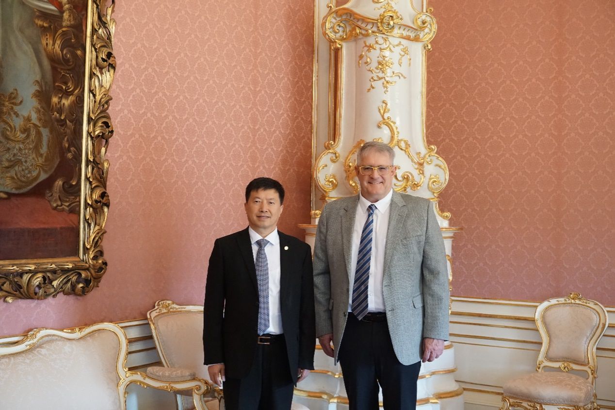 此次访问IIASA,也受到了我国常驻维也纳联合国和其他国际组织代表团的关心和支持,公使参赞沈钢和参赞扈黎光全程参与了我校与IIASA的会谈。会后,特命全权大使李松先生专门会见了刘校长及IIASA总干事和副总干事等人员,从国家外交战略出发提出了合作建议。刘校长向大使介绍了我校近年高质量发展成果,以及与IIASA的合作基础和规划,表示上海大学将继续深化与IIASA在国际科研和高层次人才培养领域的合作,在提升上海大学国际影响力的同时,努力扩大我国在国际社会的话语权。