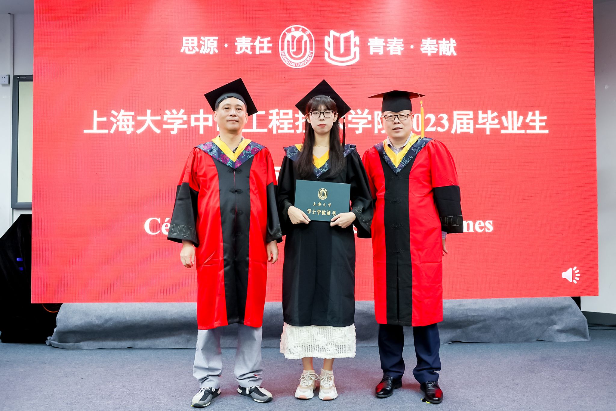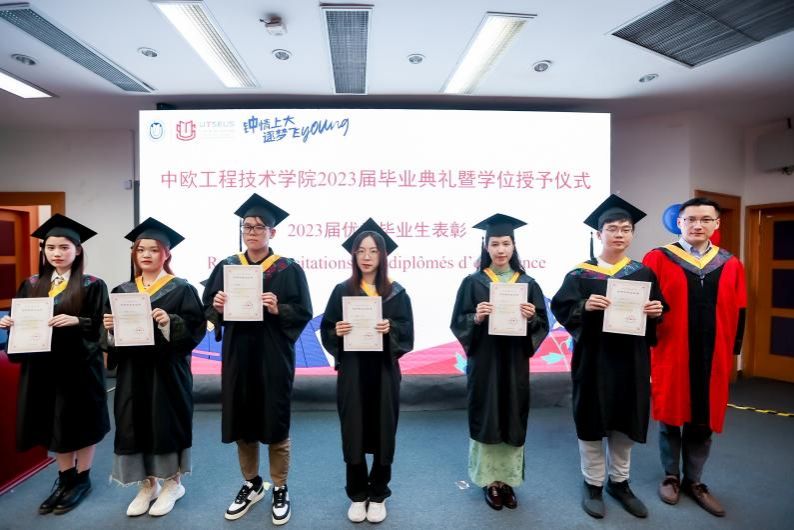 随后进行的是优秀毕业生表彰仪式,徐韬副院长和Laure副院长分别为学院获得2023届上海市优秀毕业生的6位同学和获得2023届上海大学优秀毕业生的11位同学颁发了荣誉证书,以表彰他们在本科期间在学业、科创、学术、领导力等方面的优异表现。