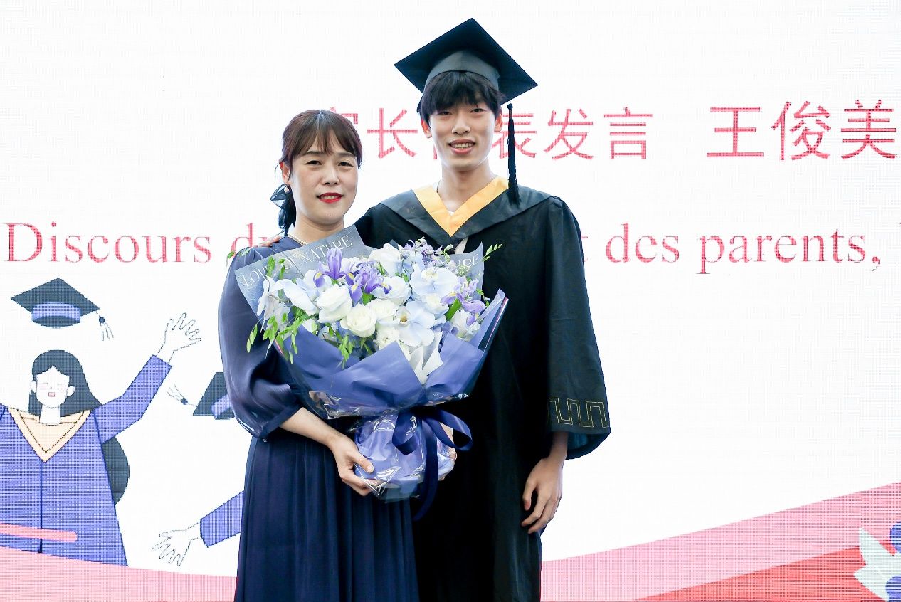随后由家长代表王俊美致辞。她感谢了学校和学院对每一位毕业生的培养和每位教师的付出,并向每一位毕业生送上祝福和殷殷嘱托。她希望同学们常怀感恩之心,牢记父母的抚养之恩和老师的培养之情,在未来的发展中为上海大学以及中欧学院增光添彩。