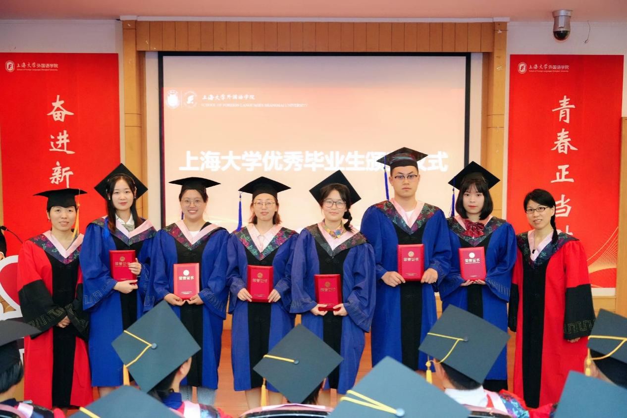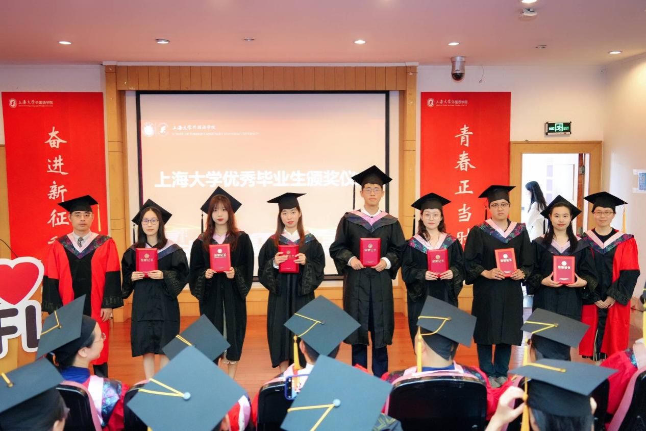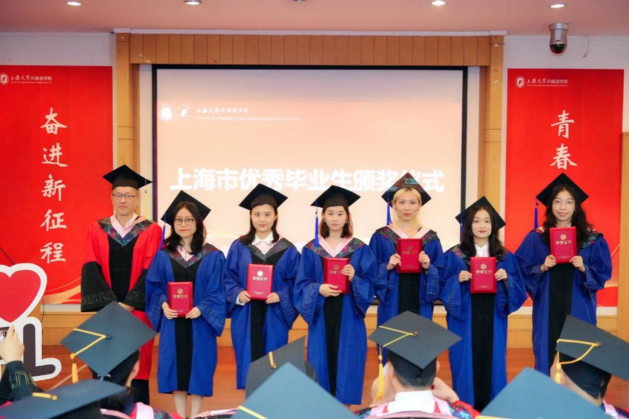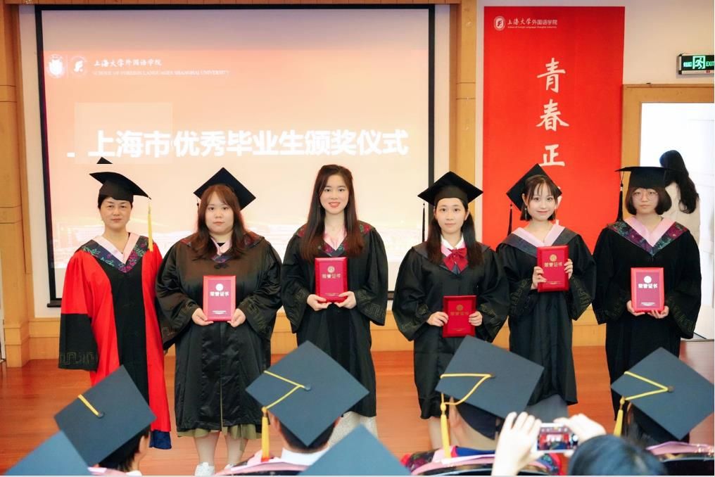 随后,英语系主任张建琴、日语系主任赵莹波为获得上海市优秀毕业生们荣誉称号的同学颁发证书;邓志勇、李晓媛、马拯、周萍为获得上海大学优秀毕业生同学们颁发证书。毕业生们从颁奖嘉宾手中接过的奖状,不仅是一份荣誉、辛勤学习的回报,更是承载了导师、学院、学校的殷切希望,希望他们谨记那份被褒奖的努力,在未来的道路上不忘初心,砥砺前行,向着更广阔的人生舞台接续奋斗。