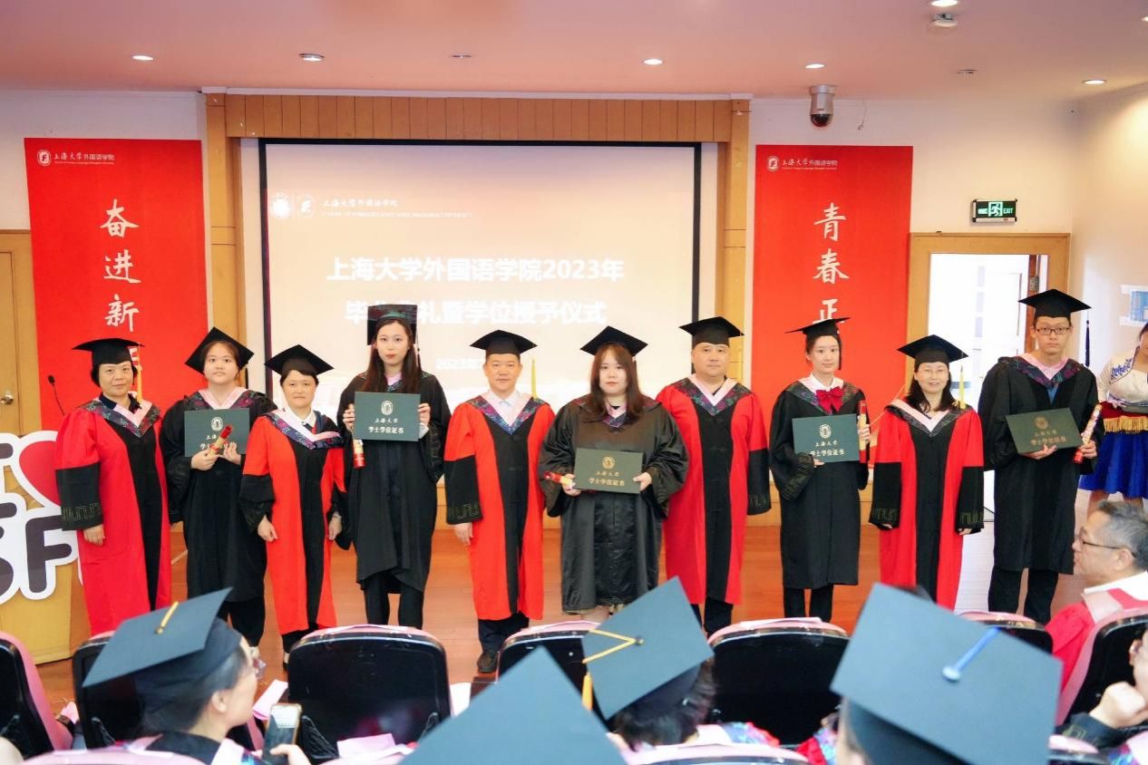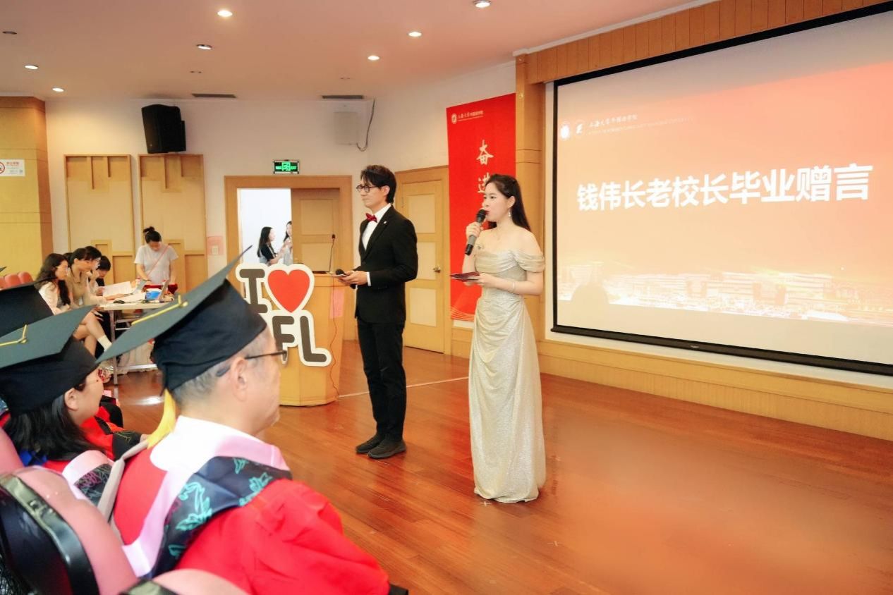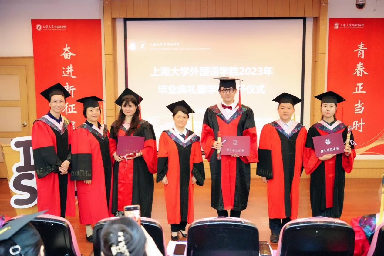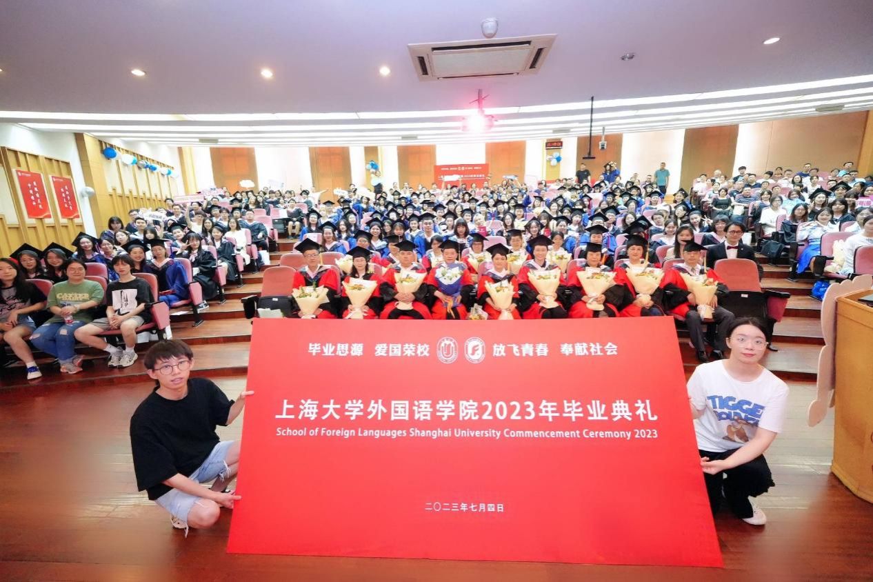 7月4日下午2点,上海大学外国语学院2023年毕业典礼暨学位授予仪式在宝山校区J103隆重举行。上海大学外国语学院党委书记吴蔚,党委副书记、院长尚新,党委副书记、副院长贾小琴,副院长戴朝晖、唐青叶、阚怀未,英语系主任张建琴,日语系主任赵莹波,教师代表邓志勇教授、李晓媛副教授、马拯副教授、唐根金副教授、朱音尔副教授、于梅欣博士、周萍博士、文雪博士以及2023届毕业生和2022届毕业生代表共同参加了本次毕业典礼。典礼由2023届毕业生章思怡、张开植主持。