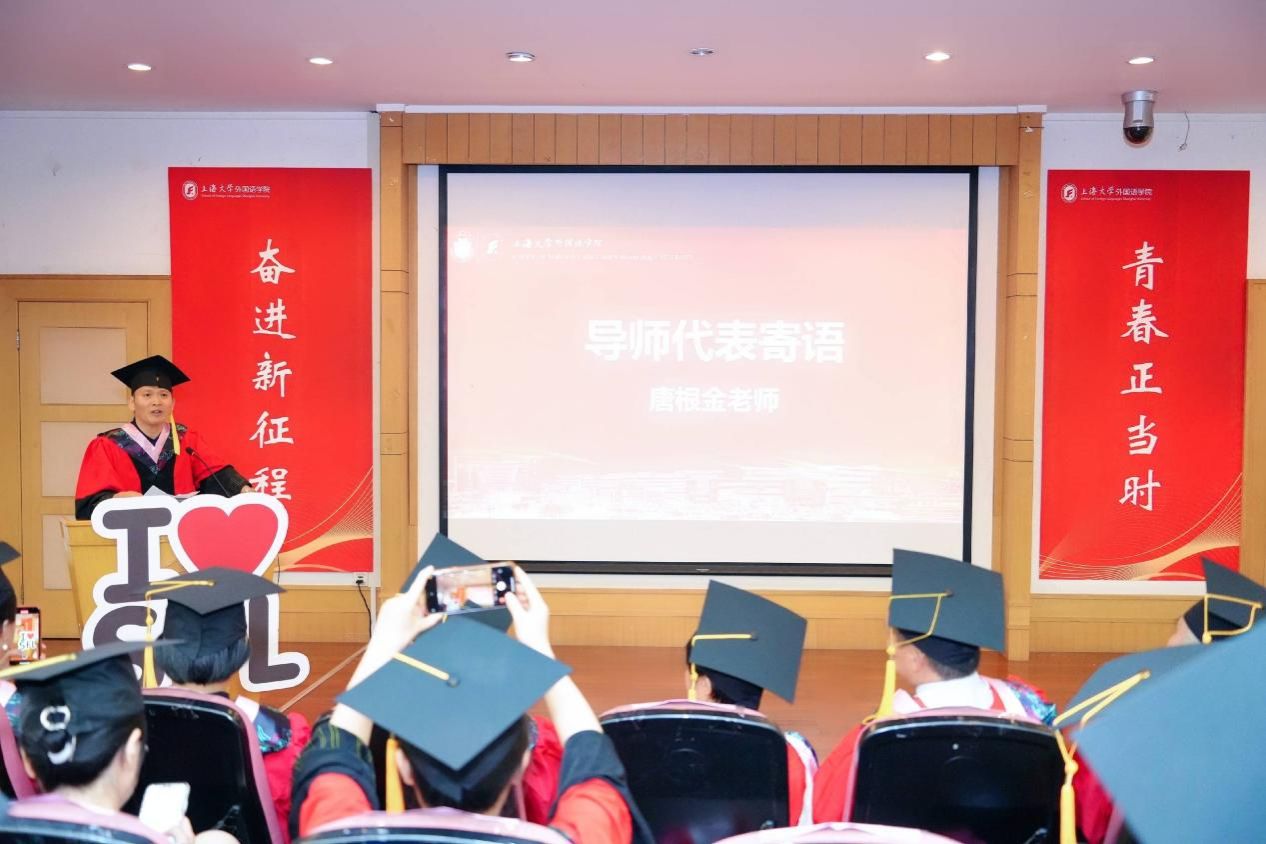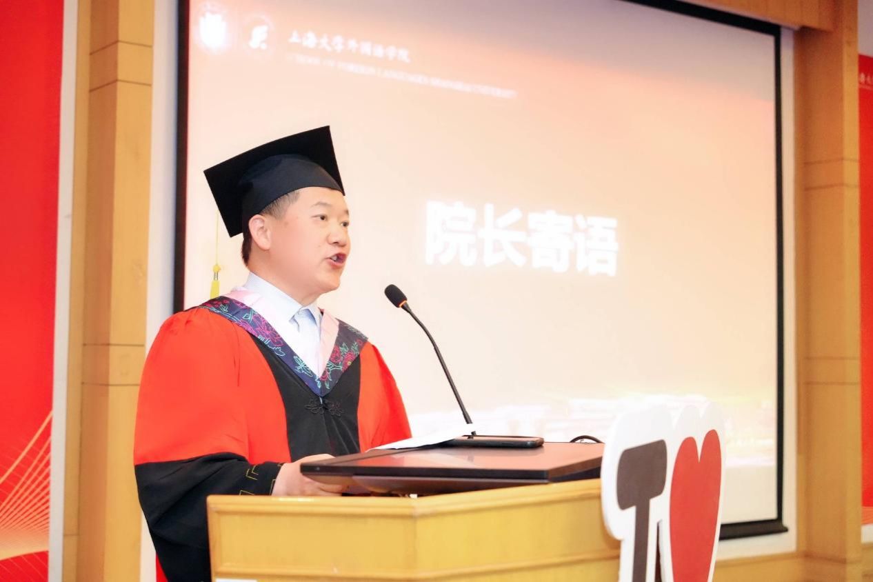 而后,外国语学院党委副书记、院长尚新教授致辞,代表全体师生员工向圆满完成学业的毕业生们表达感谢和祝贺。在此次致辞中,他指出了几个关键词。“中国灵魂,国际视野”是外国语学院人才培养的目标和灵魂所在,也是立德树人的根本、创新创业的基本理念;“先天下之忧而忧,后天下之乐而乐”、“自强不息”是上海大学的座右铭,上大学子在人生成长、事业发展,立身奉献过程中都应牢记,并为追求自身事业发展、集体的荣誉、国家的繁荣昌盛而自强不息;上海大学是一所以城市命名的大学,“海纳百川、追求卓越、开明睿智、大气谦和”是上海的城市精神,作为上大学子,同学们也应以包容的心态接人待物、以自信的状态追求卓越的自己、以低调的姿态做高调之事。最后,尚新院长以“奋进新征程,青春正当时”的主题词结束了致辞,同学们受益匪浅。