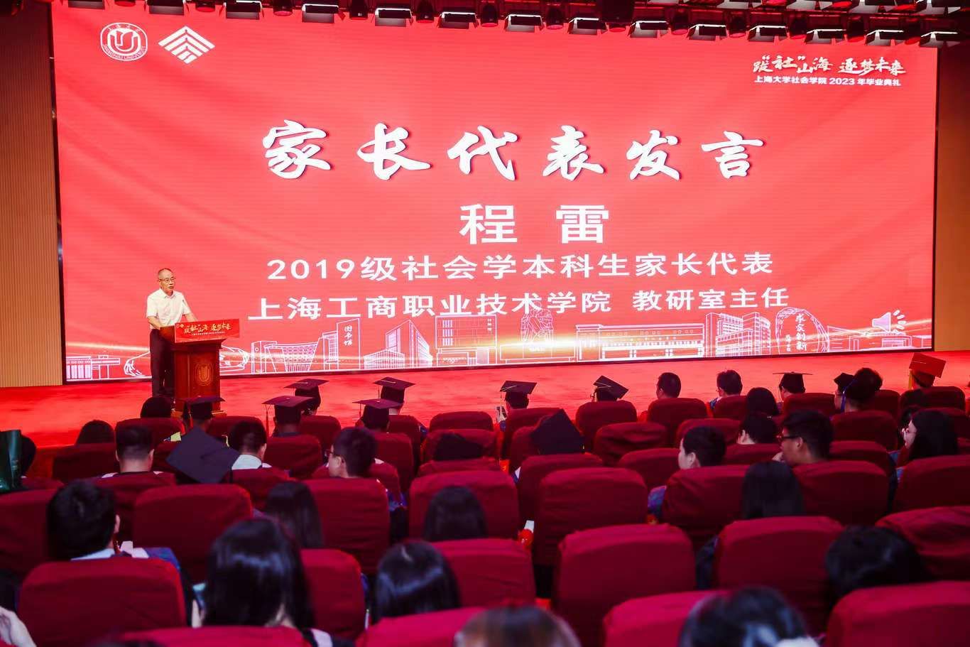 2019级社会学本科生家长代表、上海工商职业技术学院教研室主任程雷先生作为家长代表上台发言。身在一个拥有三代“上大”基因的家庭,他对上海大学怀着一份深厚的情谊。程雷先生对校院领导、老师和辅导员们耐心细致的陪伴表达了深深的感激。同时,他也祝福毕业生能够成为善良、幸福的人,在未来的日子里谨记校训院训,自强不息、扎根田野、展望未来。