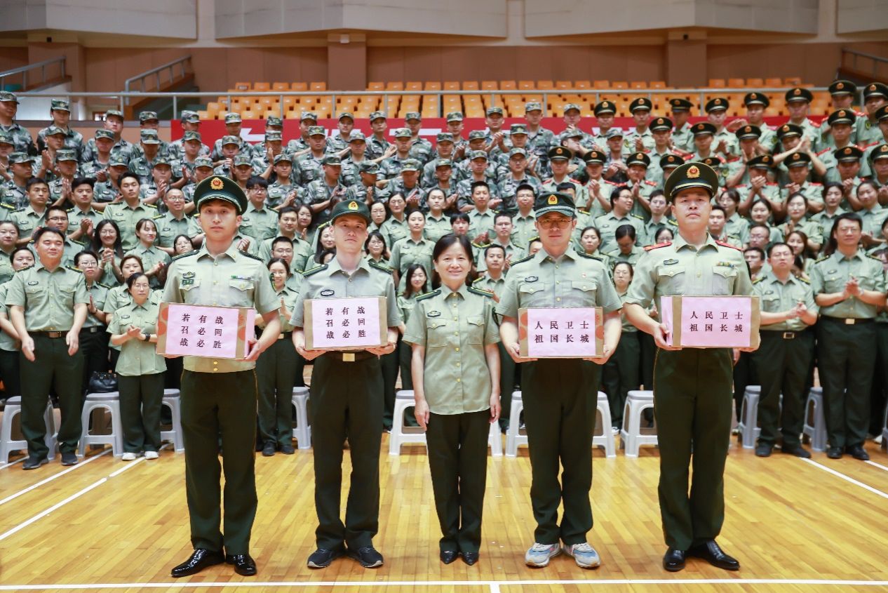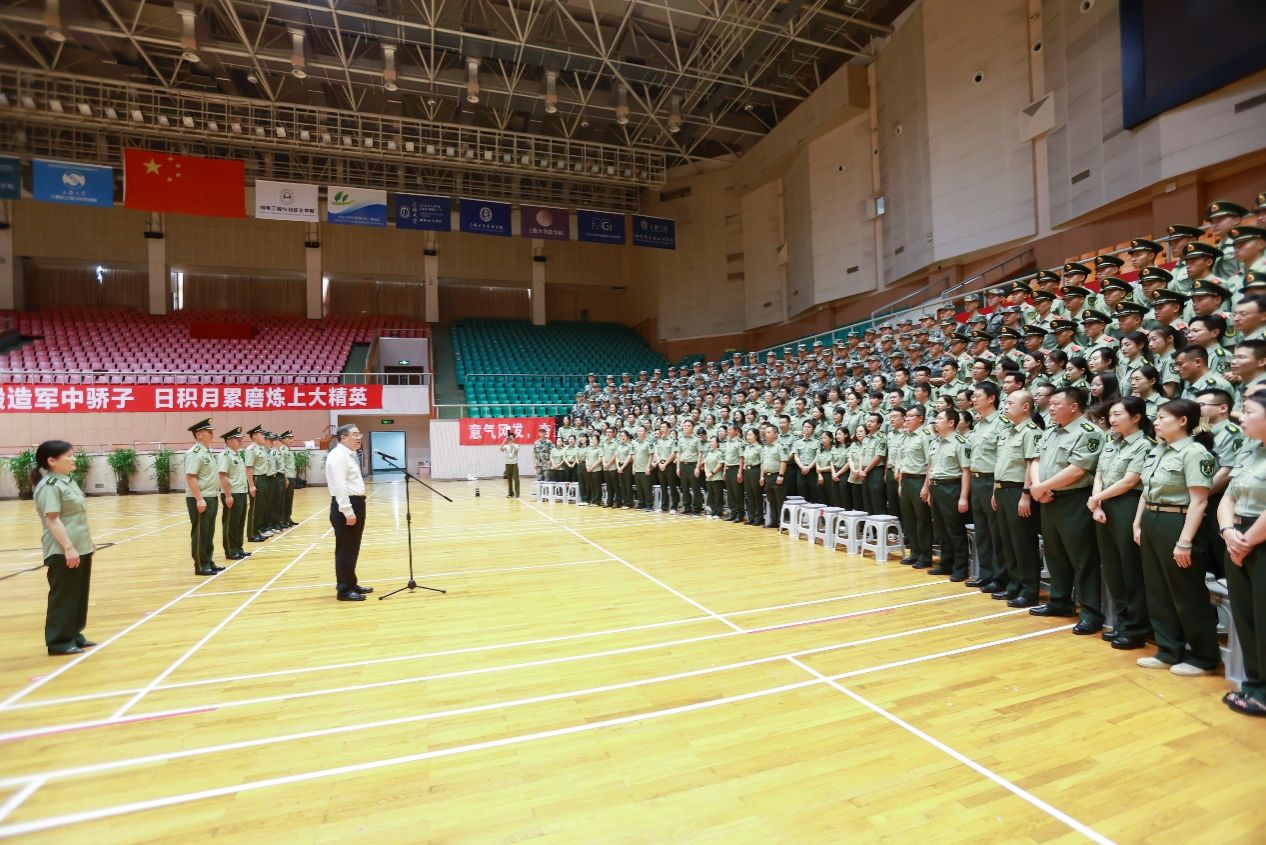 随后,成旦红一行来到校本部体育馆,慰问上海大学2023年本科生军训指战员。