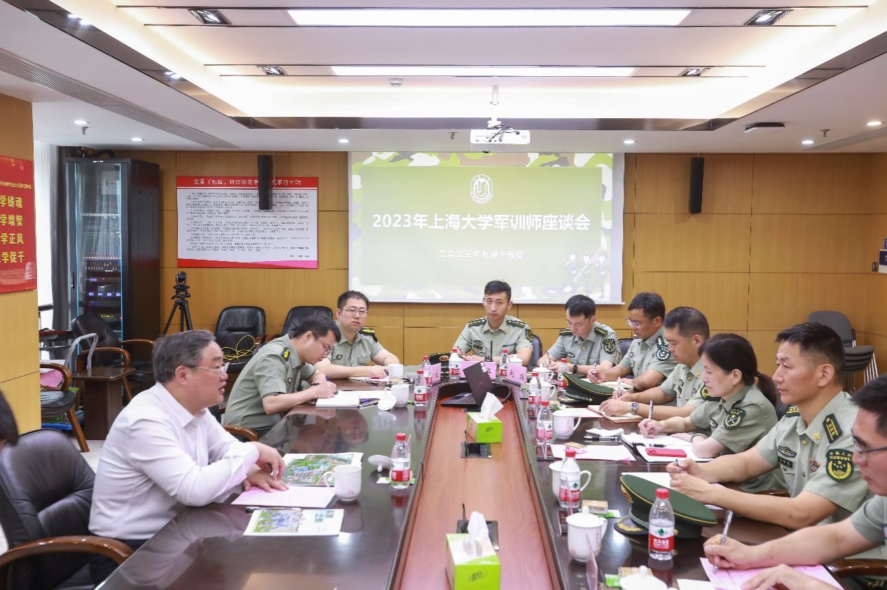 8:10,上海大学党委书记成旦红与军训师干部代表在行政楼803举行座谈会。军训师师长、武警上海总队执勤第二支队副政委卓泽旺上校,军训师政委、上海大学党委常委、副校长聂清,军训师后勤部、政治部干部代表以及军训师各团团长参与座谈。军训师副师长、学生工作办公室主任、武装部部长、本科生书院管理中心主任孟祥栋主持会议。