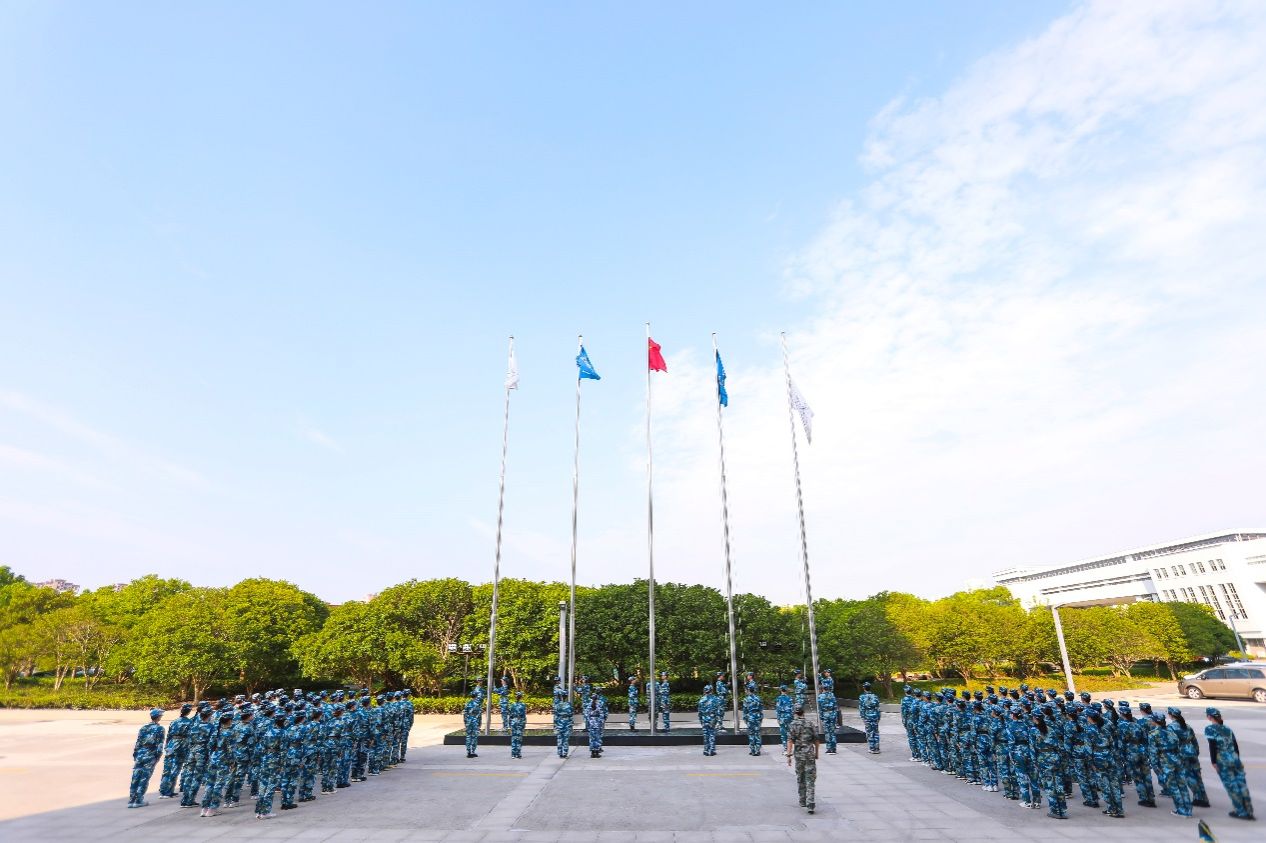 7月15日上午8:00,军训师师团干部代表在行政楼前参加升旗仪式。
