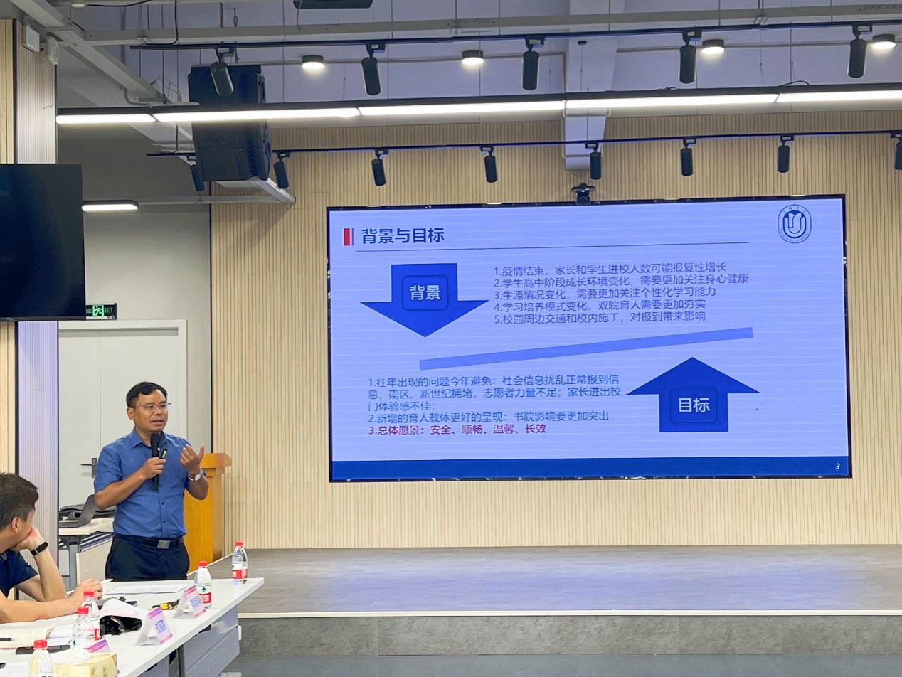 会上,学生工作办公室主任、武装部部长、本科生书院管理中心主任孟祥栋围绕学生事务工作、师生配备工作、学生培养工作这三大类任务对迎新工作进行了详细汇报。他回顾了7月份以来各部门、各书院和学院对迎新所做的各项工作,并介绍了本次校内外的迎新氛围布置以及搭建方案。各单位和部门针对迎新工作中潜在的堵点进行了深入的分析和交流。