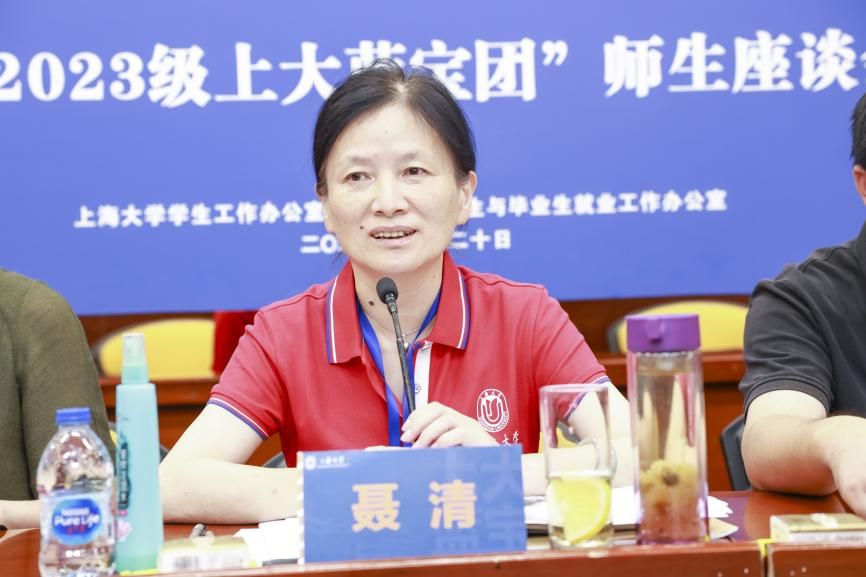 座谈会尾声,聂校长对蓝宝们送上了寄语。首先,她以上海大学的红色基因为背景,通过对上海大学校史和党的红色革命史的讲述勉励各位蓝宝要树立主人翁意识,找到生活、学习和责任的平衡点;其次,她说到大学是人生中不同于中学的新阶段,也是各位蓝宝再次出发的新征程,蓝宝们要砥砺奋进,努力绽放光彩,成为国家社会有用之人;最后,她指出蓝宝们是个不被定义的团体,是个具有无限可能的团体,希望蓝宝们坚持本心、做到极致,在未来学习与生活中勇往直前。