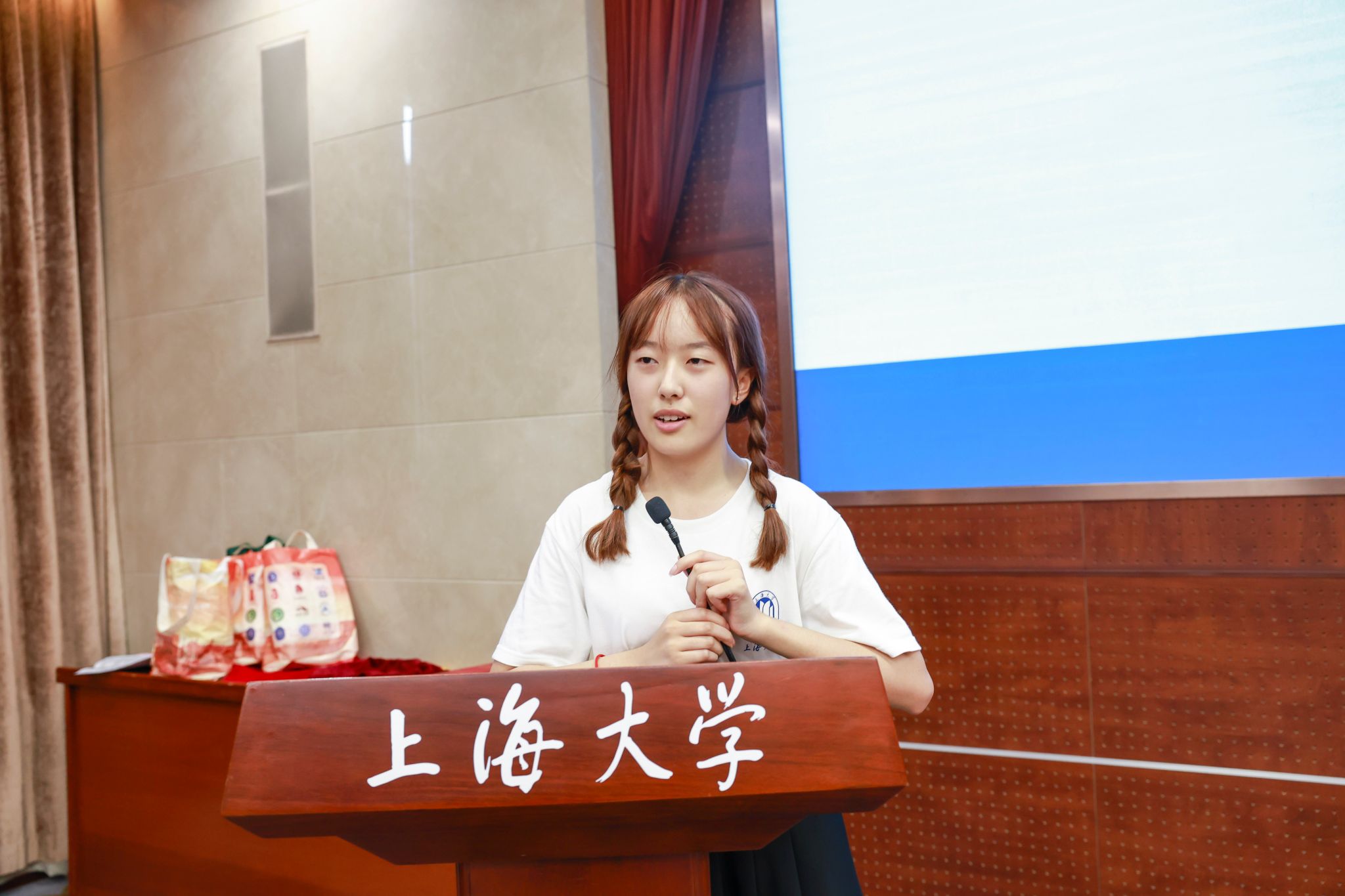 在交流环节中,蓝宝们依次进行自我介绍,他们分享了初到上大的所见所闻所感,讲述了自己与上大的渊源,表达了对未来四年学习生活的美好憧憬。