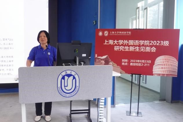 上海大学外国语学院2023级研究生新生见面会于8月23日14:00在嘉定校区二教211教室顺利举行。外国语学院党委书记吴蔚,党委副书记、院长尚新,党委副书记、副院长贾小琴,副院长戴朝晖、唐青叶、阚怀未,英语系主任张建琴,日语系主任赵莹波,法语系主任王文新,法语系副主任向维维,MTI中心副主任花亮,研究生辅导员曹若兰,研究生教学秘书张静,研究生教学秘书姚远及2023级全体研究生出席了本次活动。本次新生见面会由研究生会文体部部长程路主持。