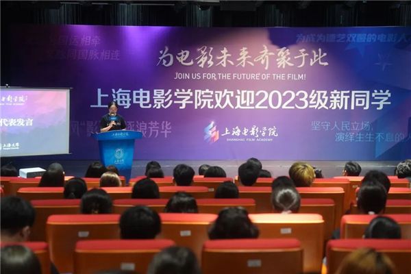 之后,上海电影学院各专业教师代表上台寄语。老师们祝愿新生感恩世界与艺术,编精彩故事,导人生大戏,热爱电影,享受电影,热爱生命的每一个时刻。