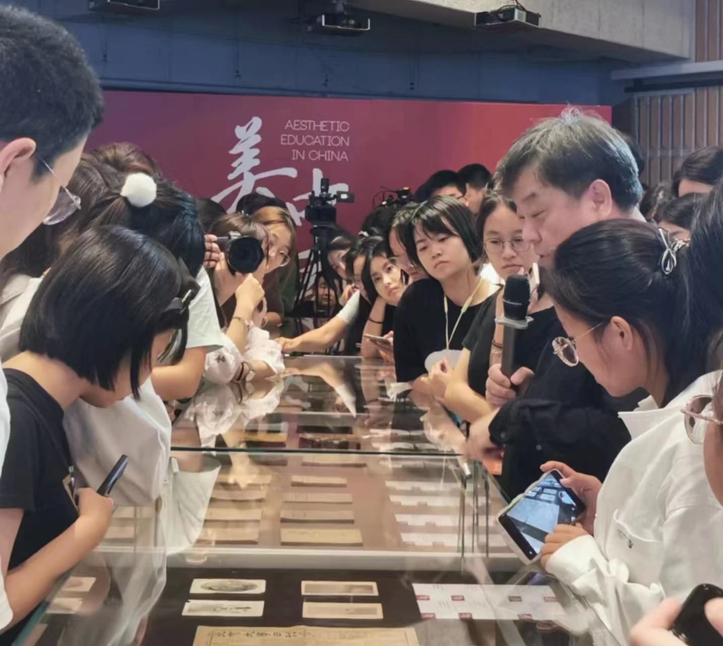“美育中国”系列课程共十讲,面向上海大学本科学生开设。由李超教授领衔,上海美术学院陈青、蒋铁骊、金江波、程雪松、毛冬华、蒋英、马琳、秦瑞丽、赵蕾、李根、陆丹丹、史晨曦等教师骨干组成授课团队。该课程有国家重大、重点课题成果转化与支持,“美育中国”文献数据库的建设专项成果支持,以珍贵的历史文献原件作为课堂学习交流的生动教材等,形成了本课程值得关注的学术创新格局与特色亮点。在第一节课上,《新青年》杂志、《美学概要》、《谈美》等珍贵文献原件,吸引了不少大一新生隔着玻璃罩细细欣赏,并纷纷举起手机拍照留念。