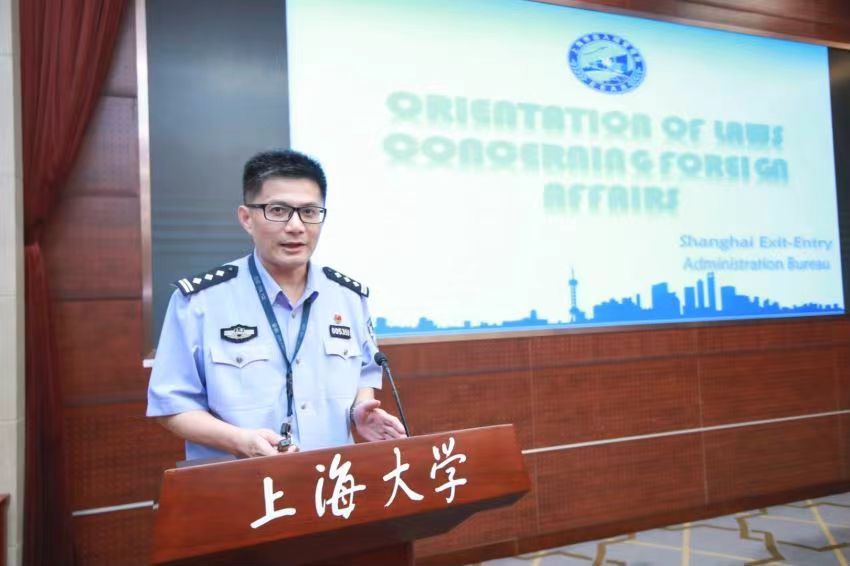 上海市出入境管理局警官王韬向外籍教师详细介绍了我国出入境签证和外国人在华停留相关管理政策,重点强调了来华工作居留许可、境外人员住宿登记、行为规范、永久居留等。