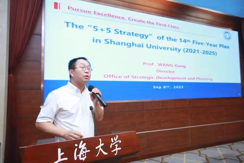 为帮助外籍教师在大学战略中找准个人定位,将个人发展融入学校事业,发展规划处处长王刚以《上海大学“十四五”规划——“五五”战略》为题,全面介绍了学校办学现状、使命愿景、“十四五”建设目标及远景目标,详细解读了学校学科发展“五五”战略。
