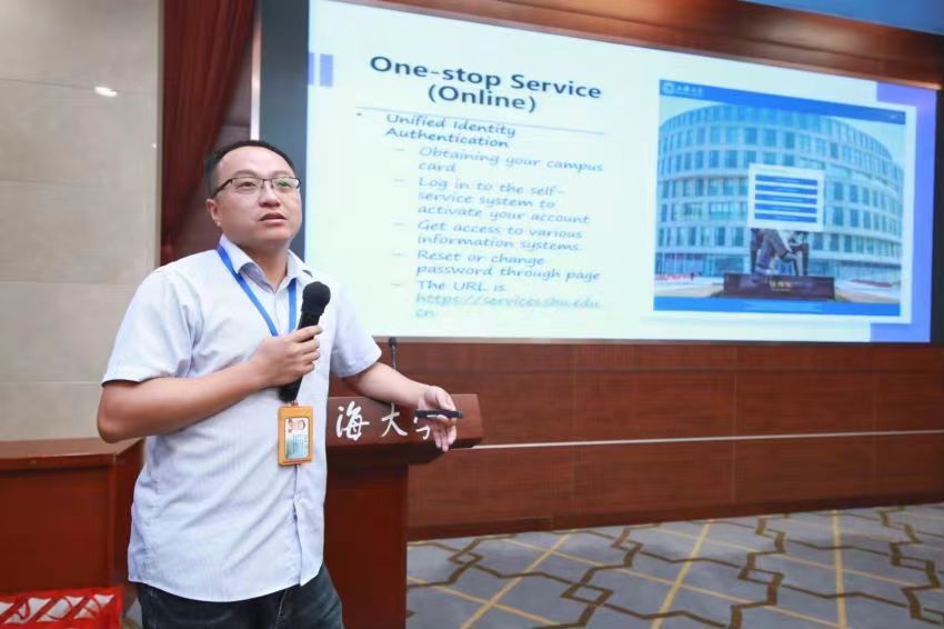 为帮助外籍教师有效利用学校信息化服务,顺利开展教学科研工作,信息化工作办公室副主任朱文浩全面介绍了学校信息化建设情况,面向外籍教师日常应用需要了解的一网通办、邮件系统、企业微信、“一站式”服务、一卡通服务等信息化应用进行了重点辅导。