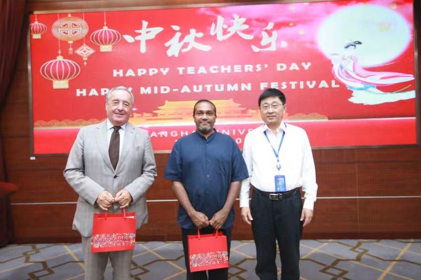 校党委副书记欧阳华对外籍教师的到来表示热烈欢迎,他重点介绍了近年来学校在教学育人、学科建设、国际声誉等方面取得的喜人成绩,并指出外籍教师是学校人才强校战略和国际化战略的共同参与者和重要贡献者,是学校高质量发展不可或缺的国际力量,学校致力于为外籍教师的事业发展和生活融入提供有力支撑,让外籍教师们感受到上海大学这个大家庭的温暖,也体会到上海这座现代化城市的温度。在教师节和中秋传统佳节即将到来之际,欧阳书记代表学校向学校全体外籍教师们致以节日的祝福。里斯本学院副院长Pedro Silva Girão,文学院教授Janaka Jayawickrama作为教师代表接受学校的节日祝福。