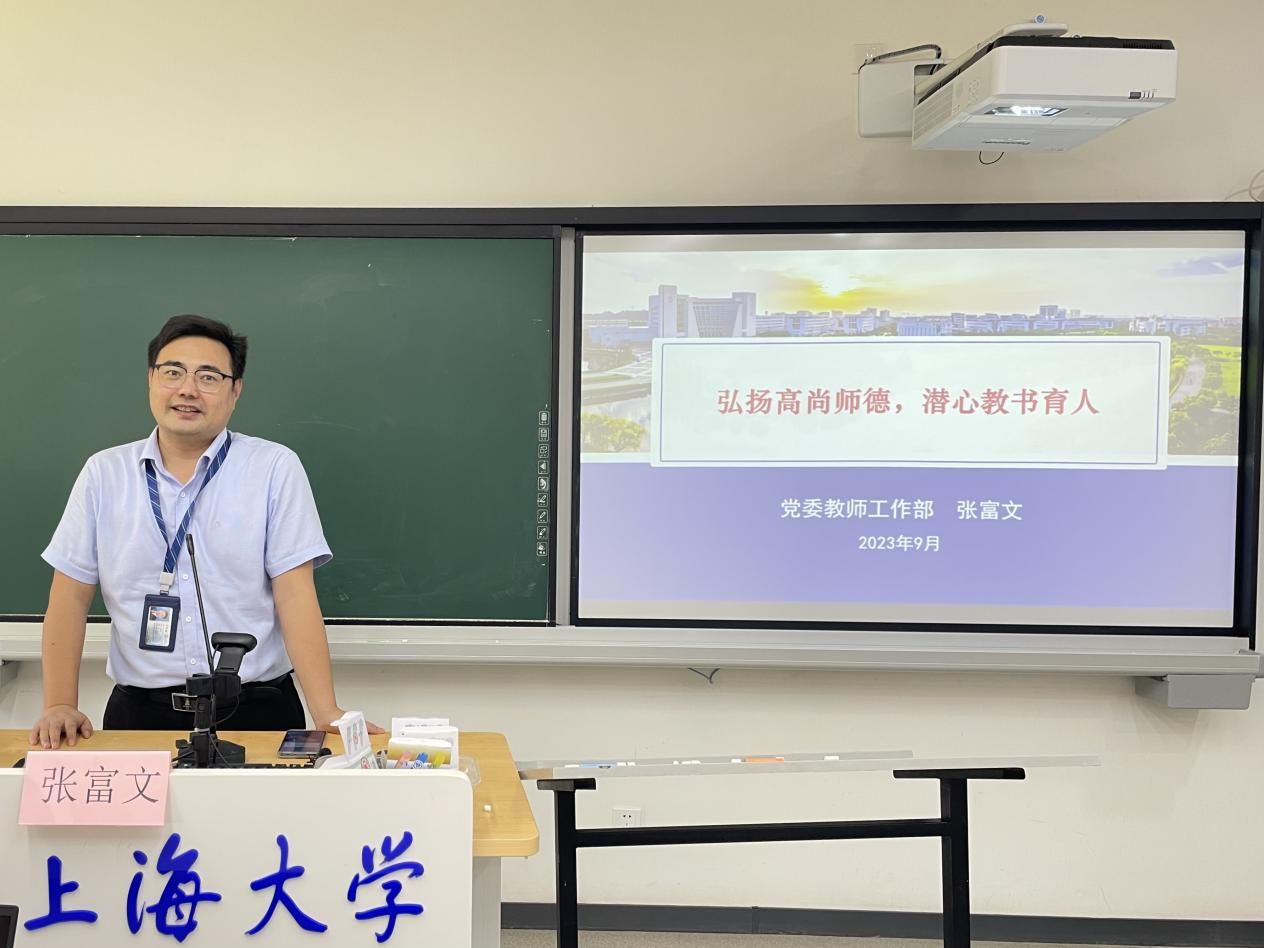 为主动迎接上海大学“师德师风建设月”,全力做好师德师风和教师思政工作,9月8日,上海大学国际教育学院在宝山校区D115举行新学期“师德师风月”系列活动。上大教工部副部长张富文,国际部党委书记王丽娜,国际部副部长、国际教育学院院长李颖洁,国际部党委副书记、国际教育学院副院长陈秀猛,国际教育学院副院长裴雨来,国际教育学院副院长张新玲,以及学院教研中心全体教师出席此次活动。活动共包括讲座、师德师风承诺书签约仪式、优秀本科全程导师代表分享暨全体导师交流三个环节。