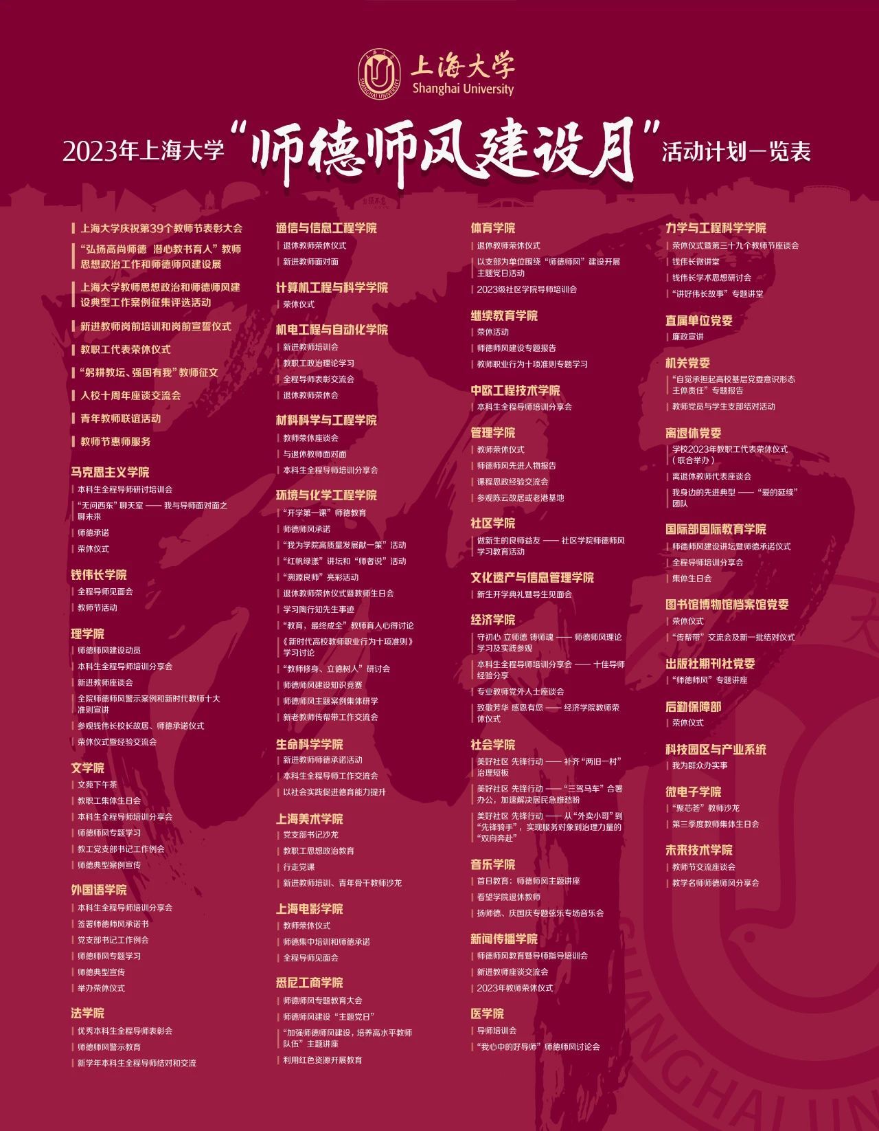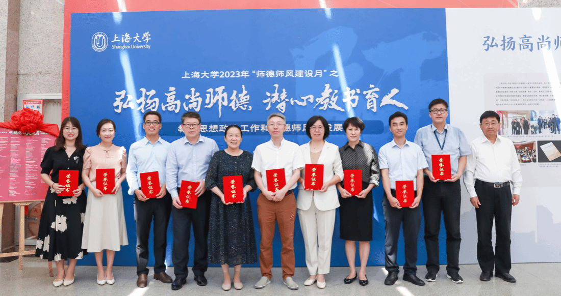 2023年9月10日是我国第39个教师节,也是党的二十大胜利召开后的第一个教师节。为贯彻落实《教育部关于做好庆祝2023年教师节有关工作的通知》和《中共上海市教育卫生工作委员会 上海市教育委员会关于做好庆祝2023 年教师节暨师德师风建设月活动有关工作的通知》要求,进一步加强教师思想政治工作和师德师风建设,上海大学2023年“师德师风建设月”启动仪式暨“教师思想政治工作和师德师风建设展”于9月8日下午在图书馆二楼展厅举行。校党委副书记欧阳华,校党委常委、党委宣传部部长胡大伟,校党委常委、组织人事部常务副部长、组织处处长沈艺,党委教师工作委员会成员单位及各二级单位党委共同出席本次活动。启动仪式由党委教师工作部部长曹为民主持。