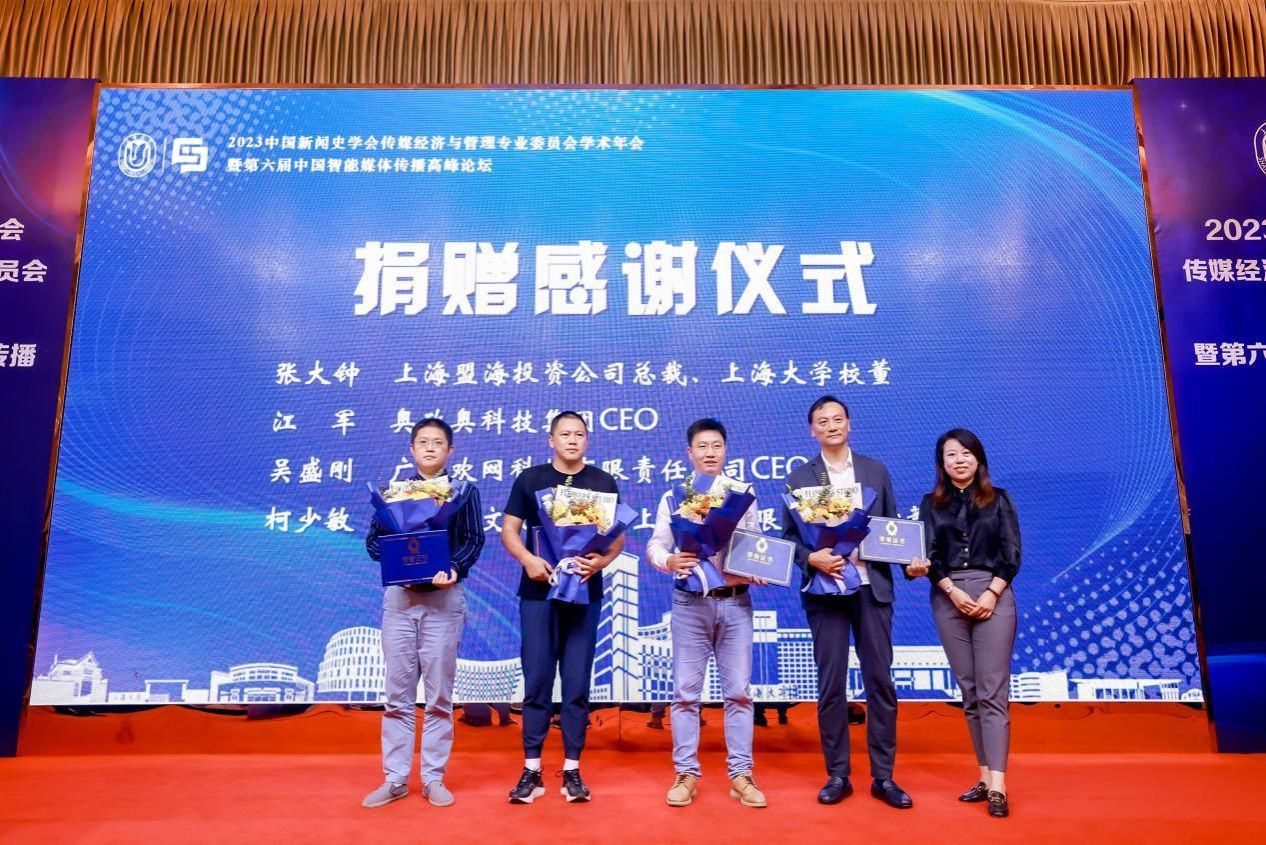 近年来,为了更好地促进上海大学新闻传播学院人才培养、科研等各项事业发展,诸多企业积极向学院捐赠。论坛举行了庄重的捐赠感谢仪式。上海大学新闻传播学院党委副书记、副院长王智君代表学院向上海大学校董、上海盟海投资公司总裁张大钟先生,奥致奥科技CEO江军先生,欢网科技CEO吴盛刚先生,美集柯执行董事柯少敏先生,分别颁发了捐赠证书。