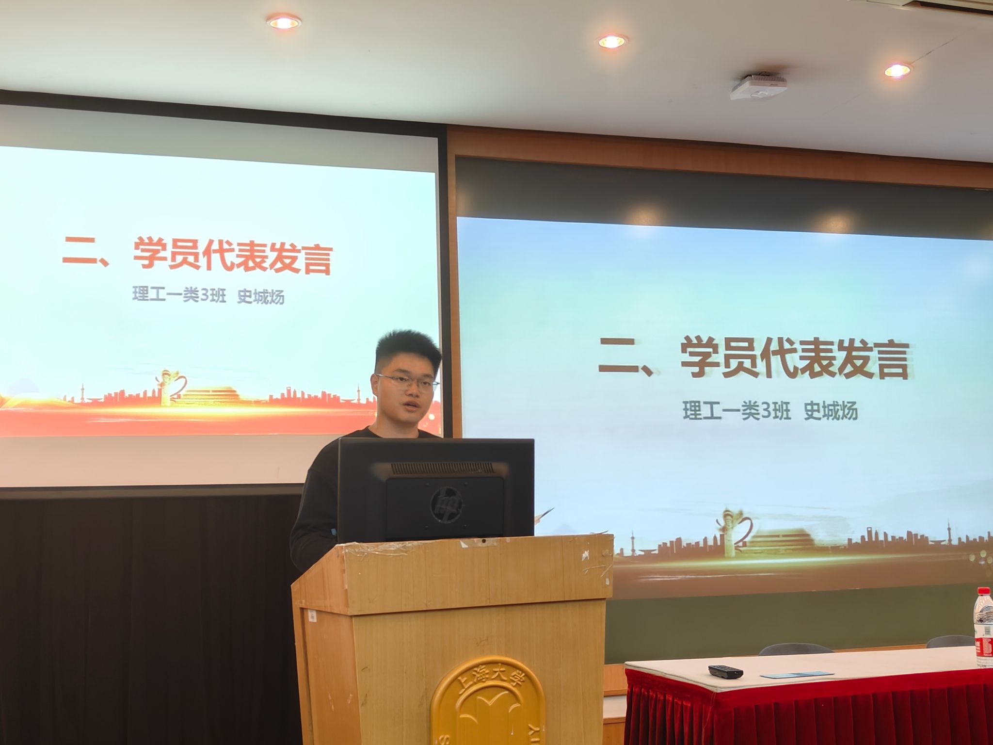 在雄壮的国歌声中开班仪式拉开序幕。首先,来自理工一组的学员代表史城炀同学以“继传承、争自强、心向党”为主题,讲述了自己从高中开始向党组织靠拢的初心与热诚,以及成为上海大学这座红色学府的一名大学生的骄傲与自豪。