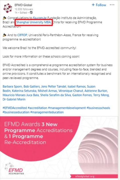 近日,上海大学MBA中心收到欧洲管理发展基金会(European Foundation for Management Development,EFMD)的正式通知,Global Local MBA(GLMBA)项目通过了EPAS (EFMDProgrammeAccreditation System,EPAS)的官方认证。