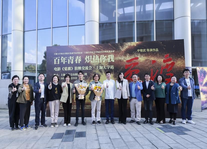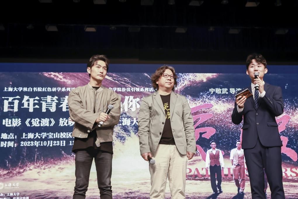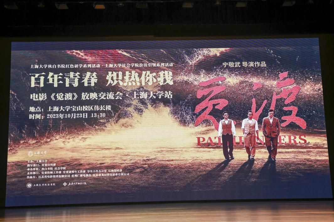 觅光明,见信仰,为国家。今年是瞿秋白同志翻译传唱《国际歌》100周年,也是恽代英、张太雷同志创办《中国青年》杂志100周年和上海大学建校101周年。2023年10月23日下午,由上海大学党委宣传部指导,秋白书院、社会学院承办的以“百年青春,炽热你我”为主题的重大革命历史题材电影《觅渡》放映交流会在上海大学宝山校区伟长楼顺利举行。出席此次活动的领导嘉宾有上海大学党委常委、组织人事部常务副部长、组织处处长沈艺,《觅渡》导演宁敬武,《觅渡》主演宋洋,《觅渡》总制片人、江苏恐龙园赞奇影业有限公司总经理沈爱华,瞿秋白亲属侄孙女、上海民办华二初级中学校长瞿平,瞿秋白亲属外甥孙、上海大学中文系93届校友王海,常州三杰纪念馆党支部书记、馆长马岚,常州三杰纪念馆副馆长唐茹玉,上海大学后勤保障部党委书记李坚,上海大学对外联络处处长、校友会办公室主任陈然,上海大学党委宣传部副部长、融媒体中心主任吴铭,上海大学社会学院党委书记杨锃,上海大学各部处和兄弟院系领导老师及学生代表、离退休教师代表、校友代表、社会学院全体党员师生,电影《觅渡》主创团队成员和媒体代表等近千名观众共同参与。活动由上海大学新闻传播学院研究生郑鲁川主持。