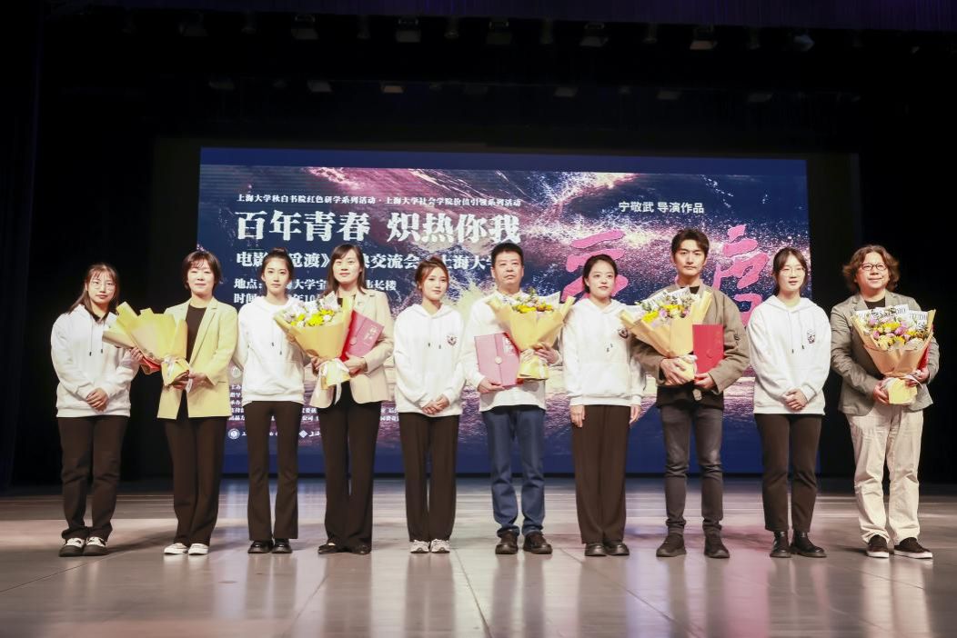 为了传承和弘扬红色校史,赓续红色基因,上海大学前期成立了以瞿秋白先辈命名的秋白书院、秋白支部。现场,社会学院党委书记杨锃老师,秋白书院执行院长、社会学院党委副书记、副院长张乃琴老师为宁敬武导演、宋洋先生、王海先生、马岚女士、唐茹玉女士颁发秋白书院校外导师聘书,期待几位嘉宾未来能走进书院,将秋白精神传递给更多书院学子。社会学院秋白党支部学生党员为嘉宾献花,表达对电影《觅渡》主创团队的感谢。