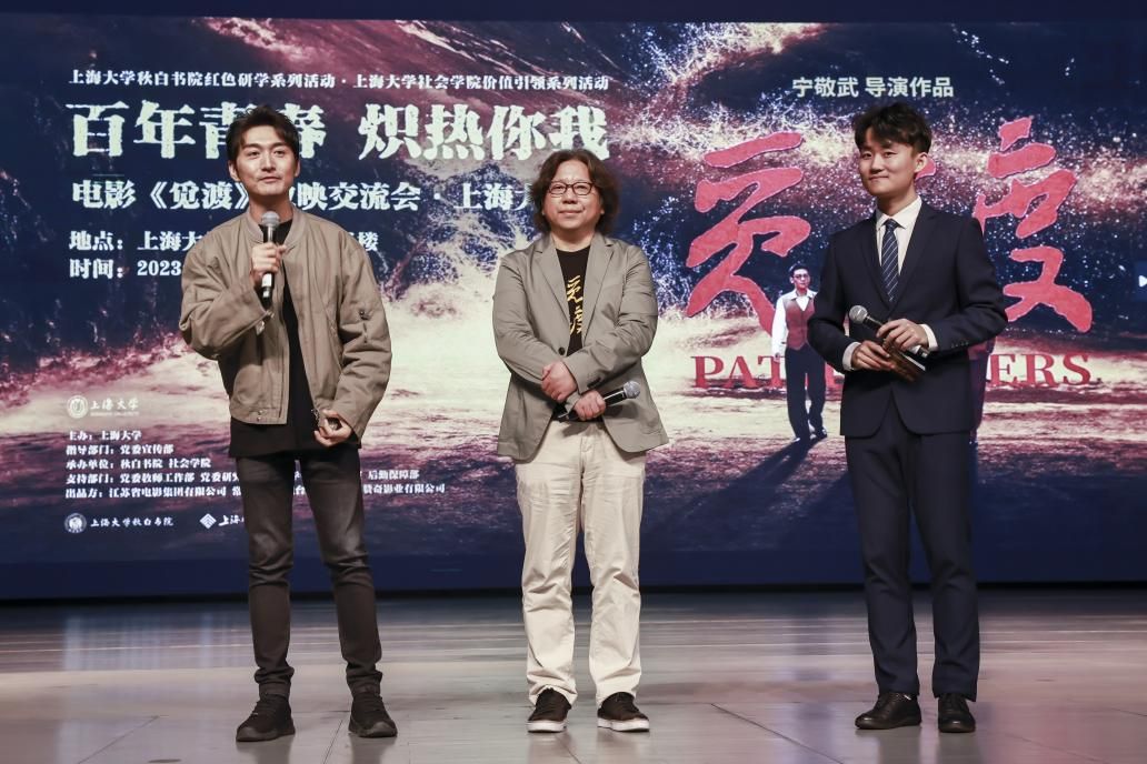 在主创交流环节,电影《觅渡》导演宁敬武先生以及影片中瞿秋白的扮演者宋洋先生也来到现场,向在座师生们分享创作感想。宁导从“100”和“101”这两个具有纪念意义的数字谈起,“100”指的是100年前瞿秋白先生回国来到了上海大学担任社会学系主任,而100年后我们带着这部影片来到了上海大学。“101”指的是今年是上海大学建校101周年,恰逢瞿秋白、张太雷、恽代英三个人的年龄加起来是101岁,他们是永远的青年。“我们今天将这部影片带给大家,也是希望现在的年轻观众能够真正读懂他们。”