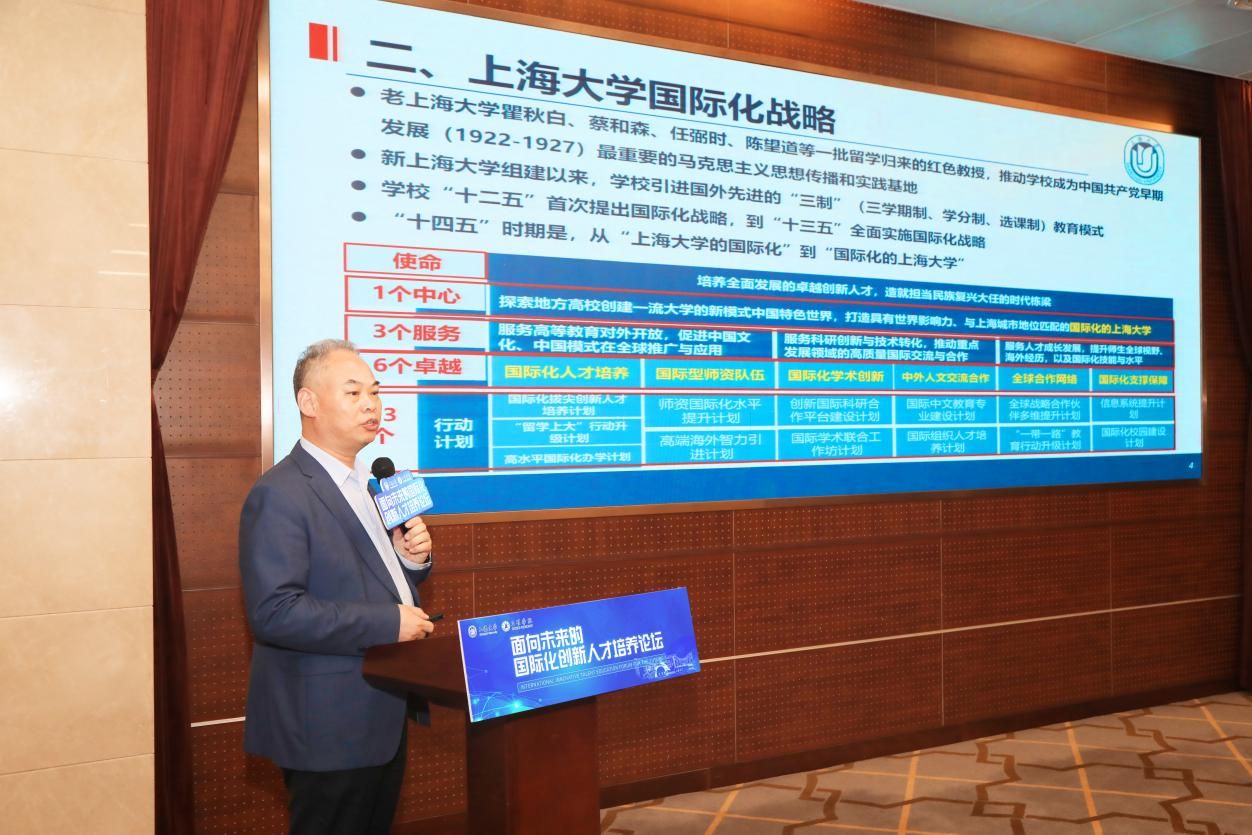 上海大学教务部常务副部长彭章友以“加强体系设计,培养国际化卓越创新人才”为题,详细阐述了上海大学国际化人才培养的体系化推进思路,介绍了学校在地国际化、跨境教育合作两大方面的建设成效,并从全球合作布局、对外开放机制等方面阐述了上海大学构筑国际化生态的努力与成果。