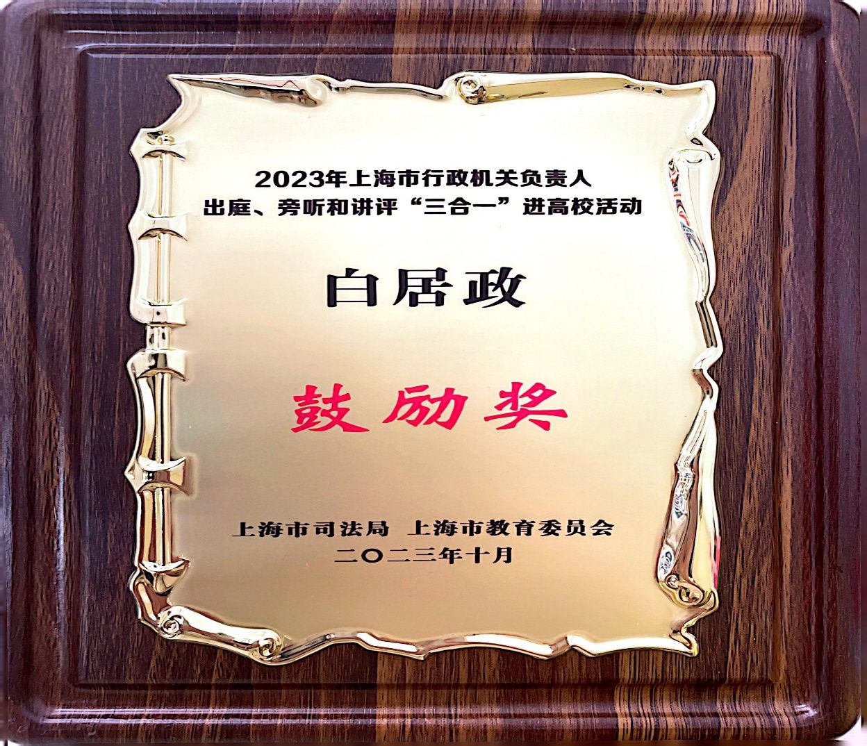 上海大学荣获行政机关负责人出庭、旁听、讲评“三合一”进高校活动优秀组织奖,法学院白居政同学荣获“三合一”进高校征文活动鼓励奖。