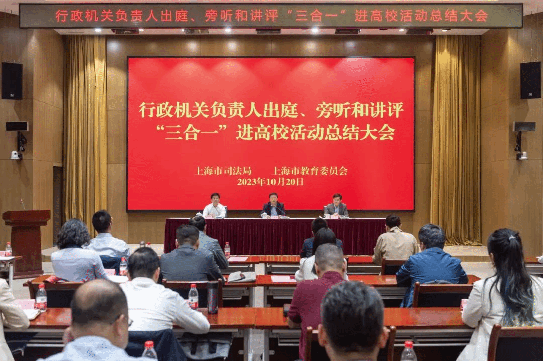 10月20日,市司法局与市教委联合召开的行政机关负责人出庭、旁听、讲评“三合一”进高校活动总结大会在上海市司法局举行,市司法局党委书记、局长吴坚勇,市教委副主任王浩参加会议并讲话。市司法局党委委员、副局长刘言浩主持会议。上海市各区司法局和上海大学、复旦大学等高校代表参加会议。