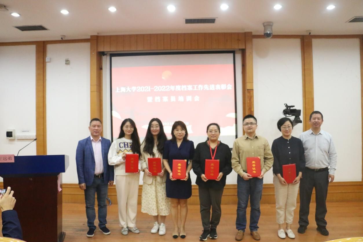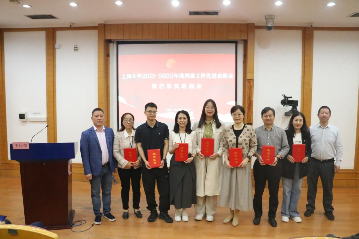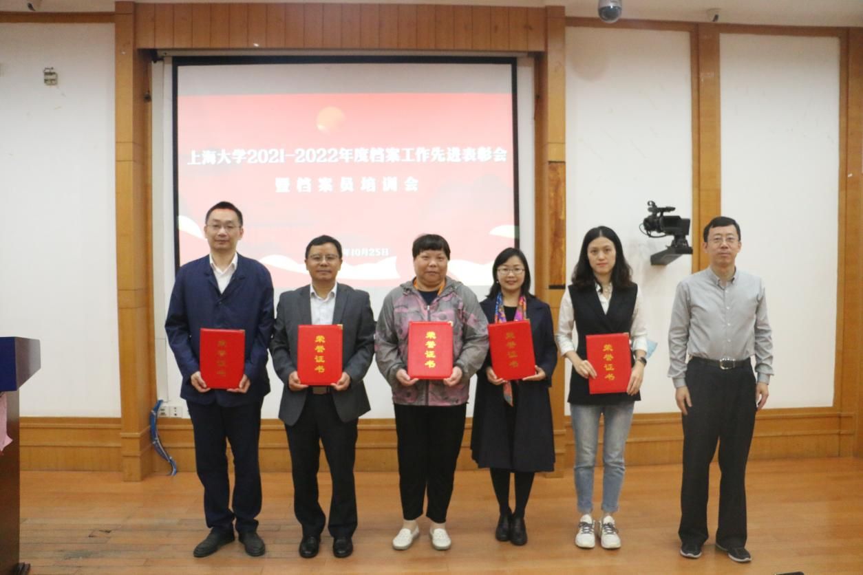 图书馆博物馆档案馆党委书记王远弟宣读了上海大学2021-2022年度档案工作先进集体和先进个人名单。段勇书记和王远弟书记分别为档案工作先进集体和先进个人颁发了荣誉证书。