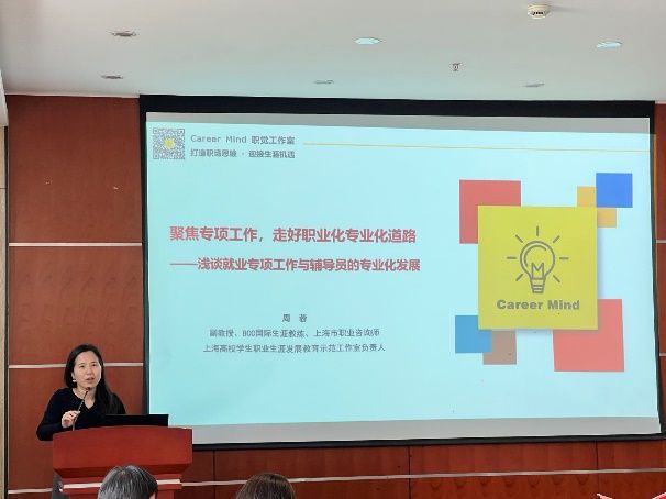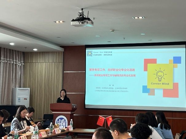 上海理工大学机械工程学院学工办主任周蓉作了题为《聚焦专项工作,走好职业化专业化道路——浅谈大学生就业专项工作与辅导员的专业化发展》的主题报告。周蓉老师指出了就业专项工作发展之源,即兴趣+坚持+思考+载体;就业专项工作发展之本,即理论+目标+构建+落实;就业专项工作特色之路,即系统+聚焦+持续+示范。结合自己身工作经验,分享了就业工作专业化发展的路径。
