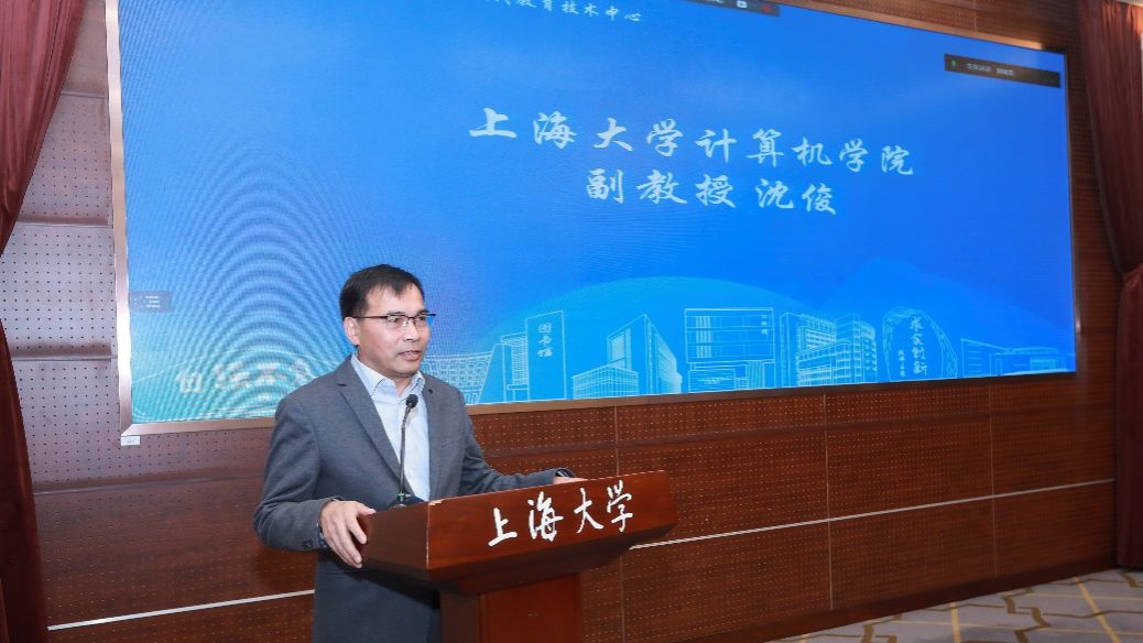 上海大学教务部现教中心主任陈章进介绍了现教中心的概况。现教中心现隶属于教务部,服务管辖学校440间公共教室,36间公共计算机实验室。陈主任接下来介绍了智慧共享实验室,现教中心运营的各大系统、平台等。陈主任还重点介绍了信创计算机多媒体实验室。从项目立项、设备进校、施工建设、试运行直至今天平稳运行,为师生服务。他指出,信创计算机多媒体实验室的建成是现教中心响应国家推动信息技术应用创新产业发展的要求、探索信创产品在高校教学和科研中的定位与发展方向、增强信创产品在高校师生中认知度的一个有益尝试。