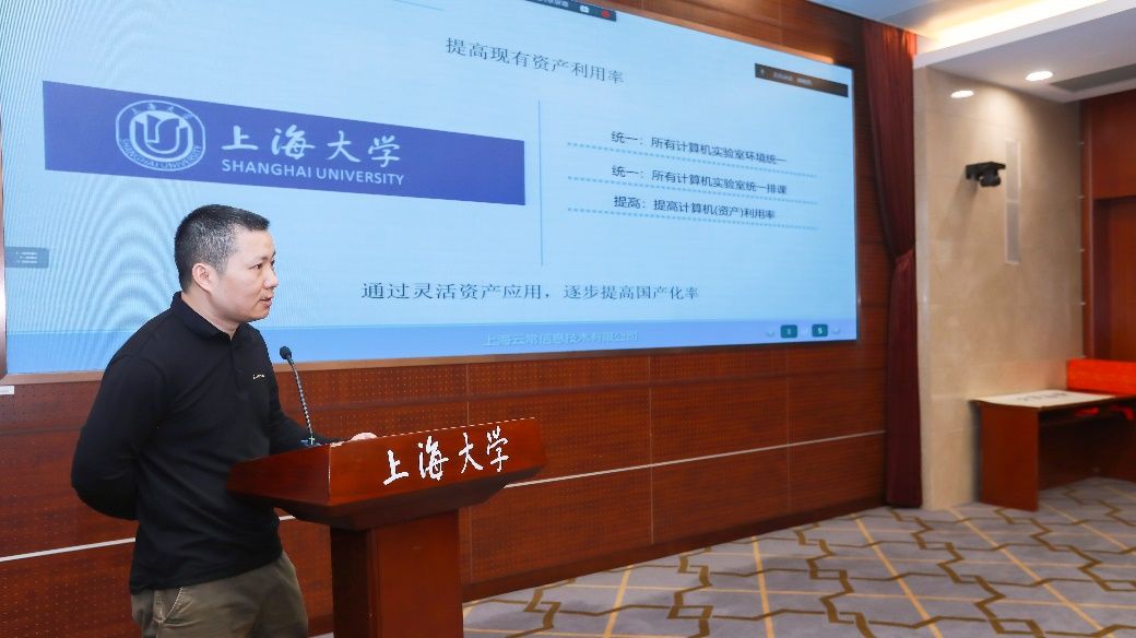 上海云常信息技术有限公司技术总监张帝介绍了“两个统一,一个提高”,期待所有计算机实验室环境统一,所有计算机实验室统一排课,提高计算机(资产)利用率。