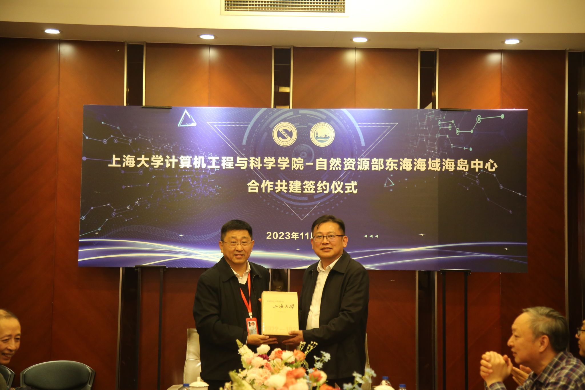 签约仪式上,自然资源部东海海域海岛中心主任王晓亮、上海大学计算机学院党委书记朱宏涛代表双方签署合作共建协议。上海大学党委副书记欧阳华向自然资源部东海局副局长杨华赠送《上海大学(1922-1927)全史》。