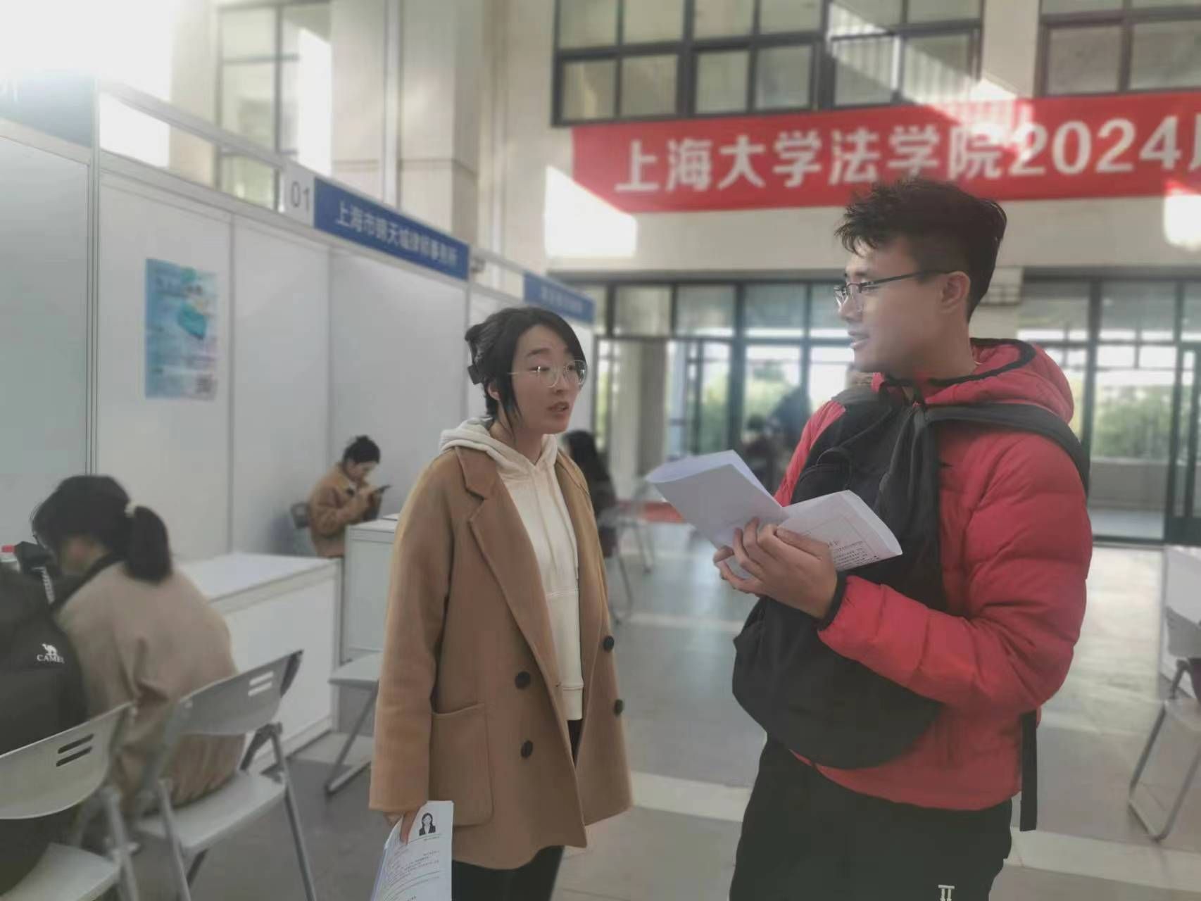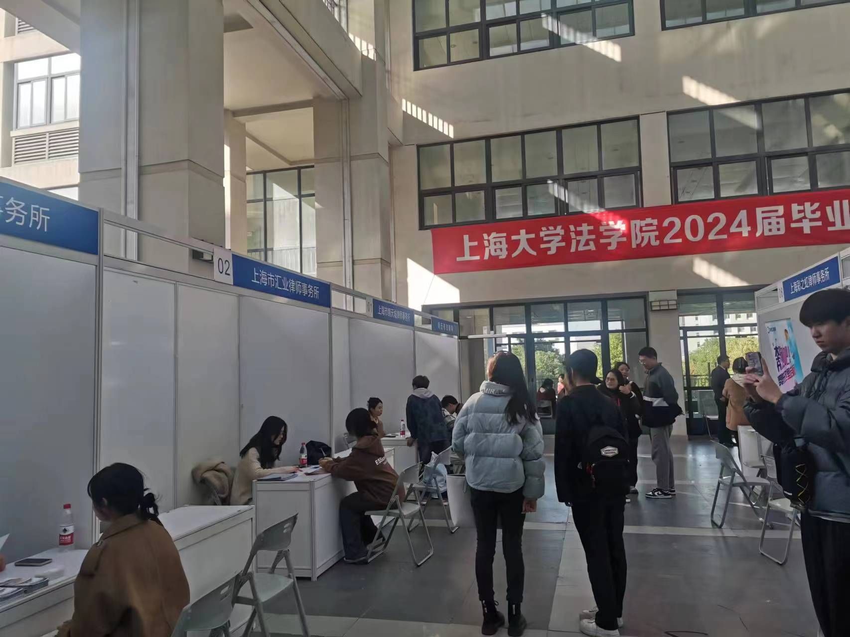 在上海大学招生就业处的大力帮助和指导下,11月17日下午,上海大学法学院在宝山校区东区经管大楼二楼平台举办了2024届毕业生招聘会(第一场)。本次招聘会邀请了多家知名律所和企业,为法学院毕业生提供了丰富的就业机会和选择空间。本次招聘会旨在加强法学院毕业生与各类用人单位的有效对接和互动,提升学生就业的专业匹配度,促进学校与企业的深度合作和交流,构建双向选择的优质平台。