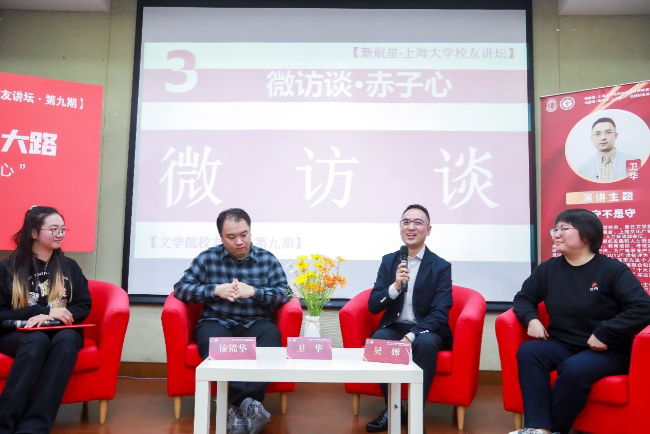 金秋时节,繁花似锦。为凝聚文院校友情谊,助力文院学子成长,11月19日下午,新航星·上海大学校友讲谈暨文学院第九期校友讲坛,文院情·青年说·上大路——文院校友谈“不忘赤子心”在宝山校区东区蔡冠深讲堂顺利举行。