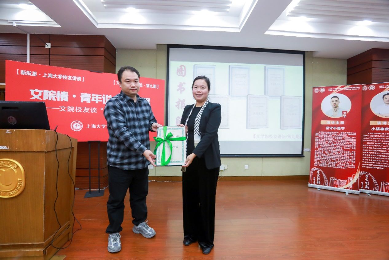 最后,刘旭光院长、丁佳蒙副书记为校友们赠送了精美的专属纪念礼品。在校友们重拾了一段珍藏回忆,同学们收获了多份宝贵经验之后,新航星•上海大学校友讲谈暨文学院第九期校友讲坛圆满结束。