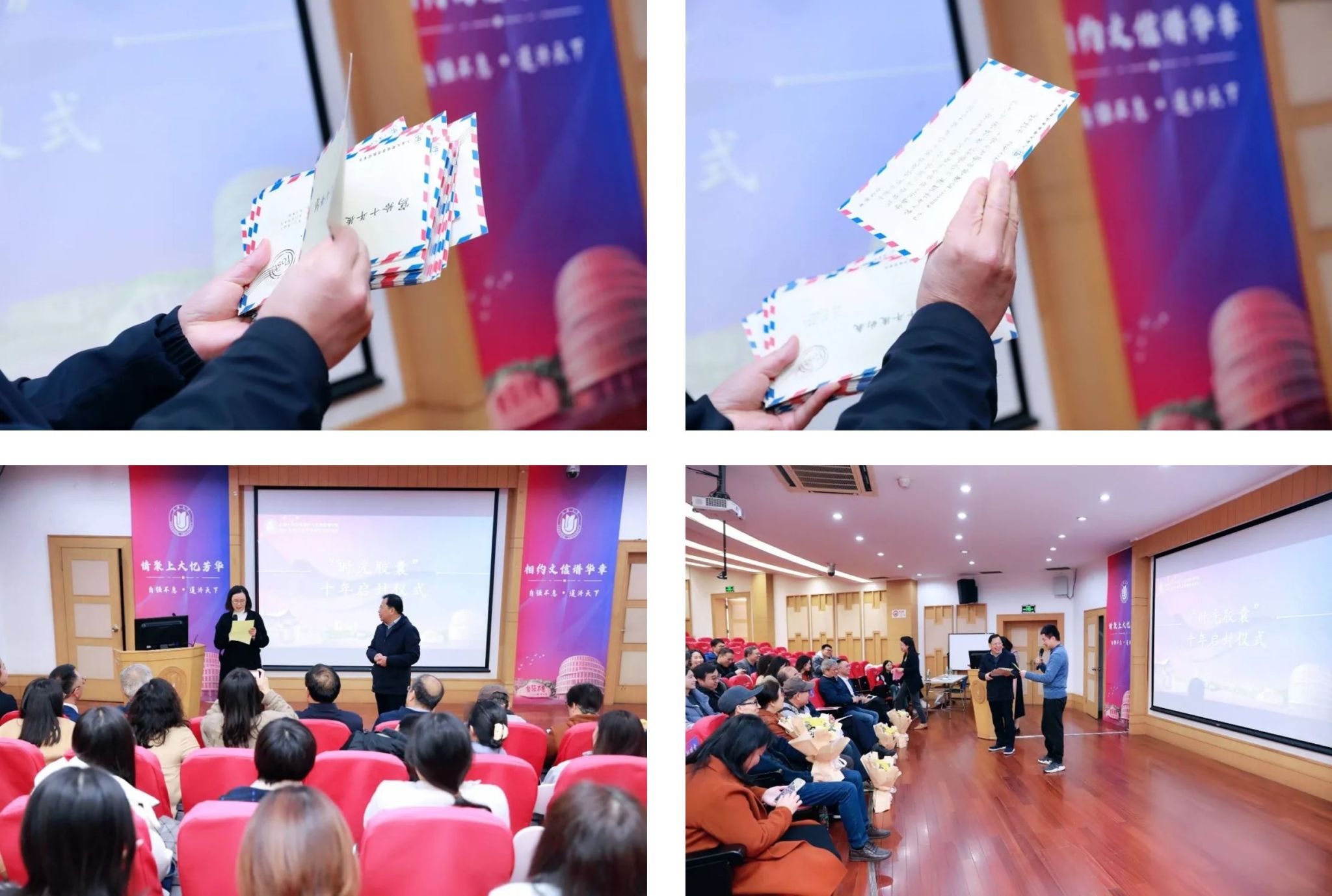 “时光胶囊”十年启封仪式上,学院党委书记丁华东教授为校友们打开穿越时空的档案袋。