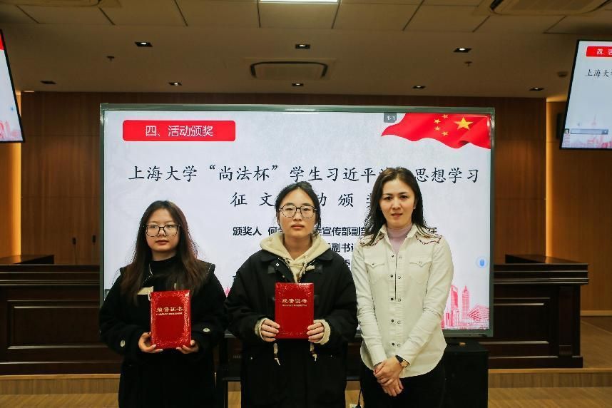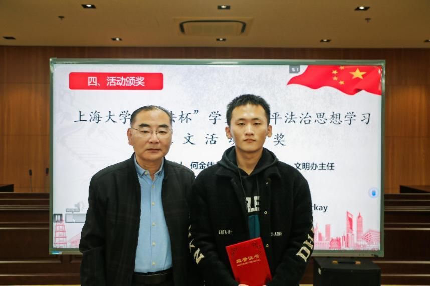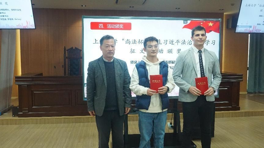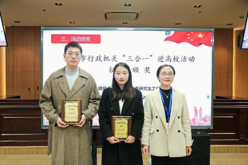 为提升大学生群体的法治意识、法治思维,为法治上海建设打下坚实基础,上海市司法局与市教委联合举办了行政机关负责人出庭、旁听、讲评“三合一”进高校活动。上海大学荣获由市司法局、市教委颁发的“三合一”进高校优秀组织奖,2名同学在征文活动中获奖。党委研究生工作部部长魏宏为法学院白居政、金娱同学颁发“三合一”进高校征文活动奖牌。