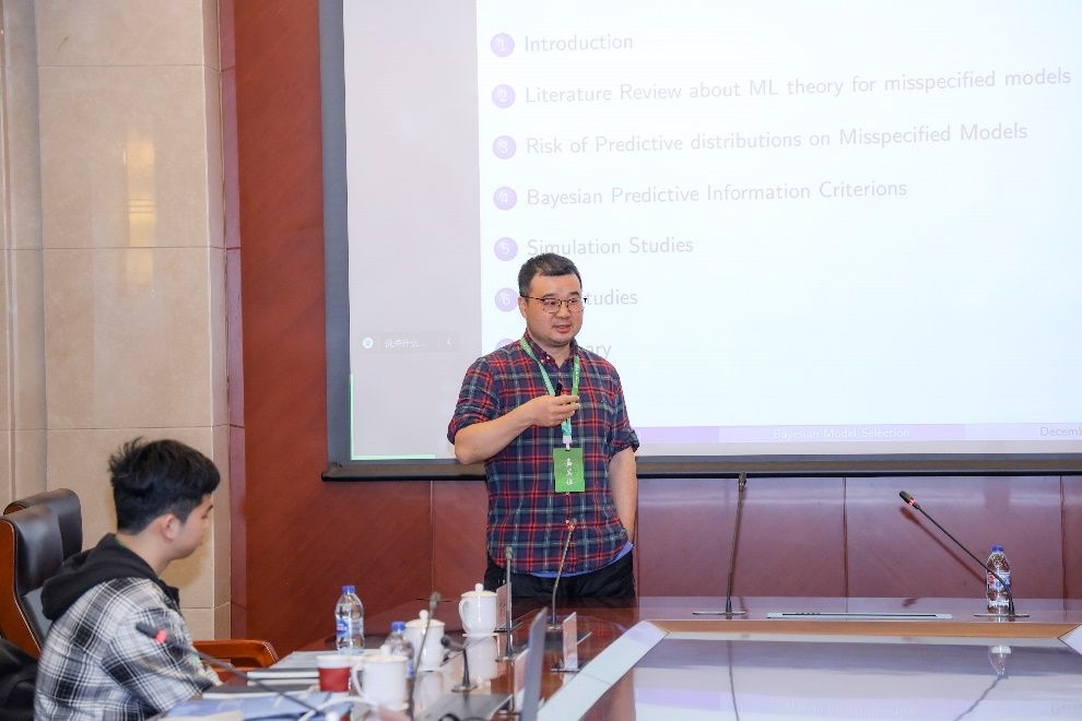 李勇教授的报告主题是“Risk of Predictive Distributions and Model Comparison on Misspecified Model”。李教授指出,对于可能存在错误设定的模型,从预测的角度来看,通常有三种不同的预测分布可供候选使用,即插入式预测分布、常规的贝叶斯预测分布以及Muller(2013)提出的夹层贝叶斯后验预测分布。在K-L损失函数下,李教授和合作者证明了夹层贝叶斯预测分布比常规贝叶斯预测分布具有更低的渐近风险,提出了存在错误设定情形下的信息准则,并通过在经济学和金融领域的实证分析展示了其实际应用。